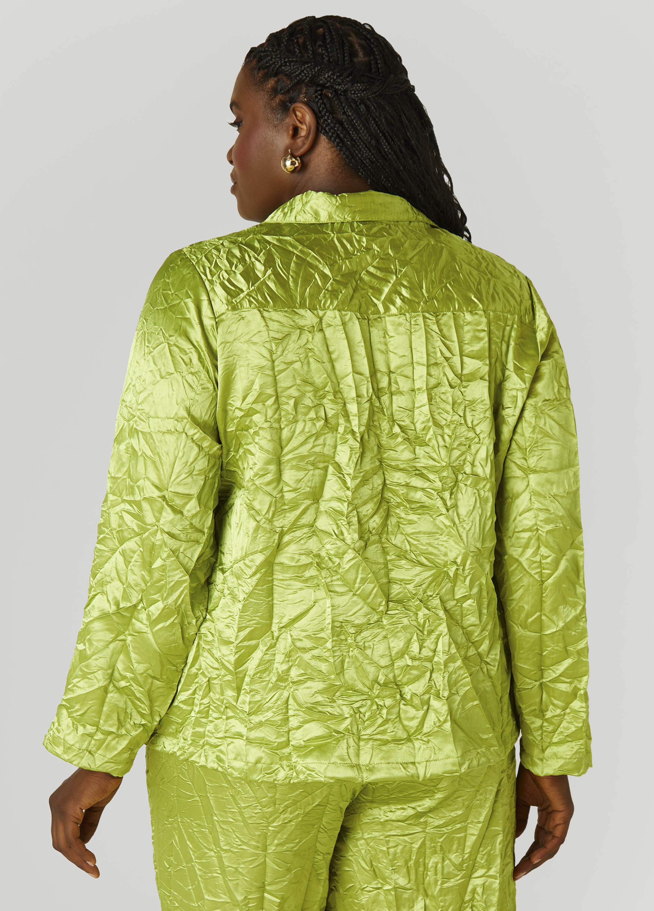 This crinkled satin shirt brings the shine with zero effort required. It’s slinky, swipe-worthy and ready to team up with the matching pants for a set that knows how to show up.