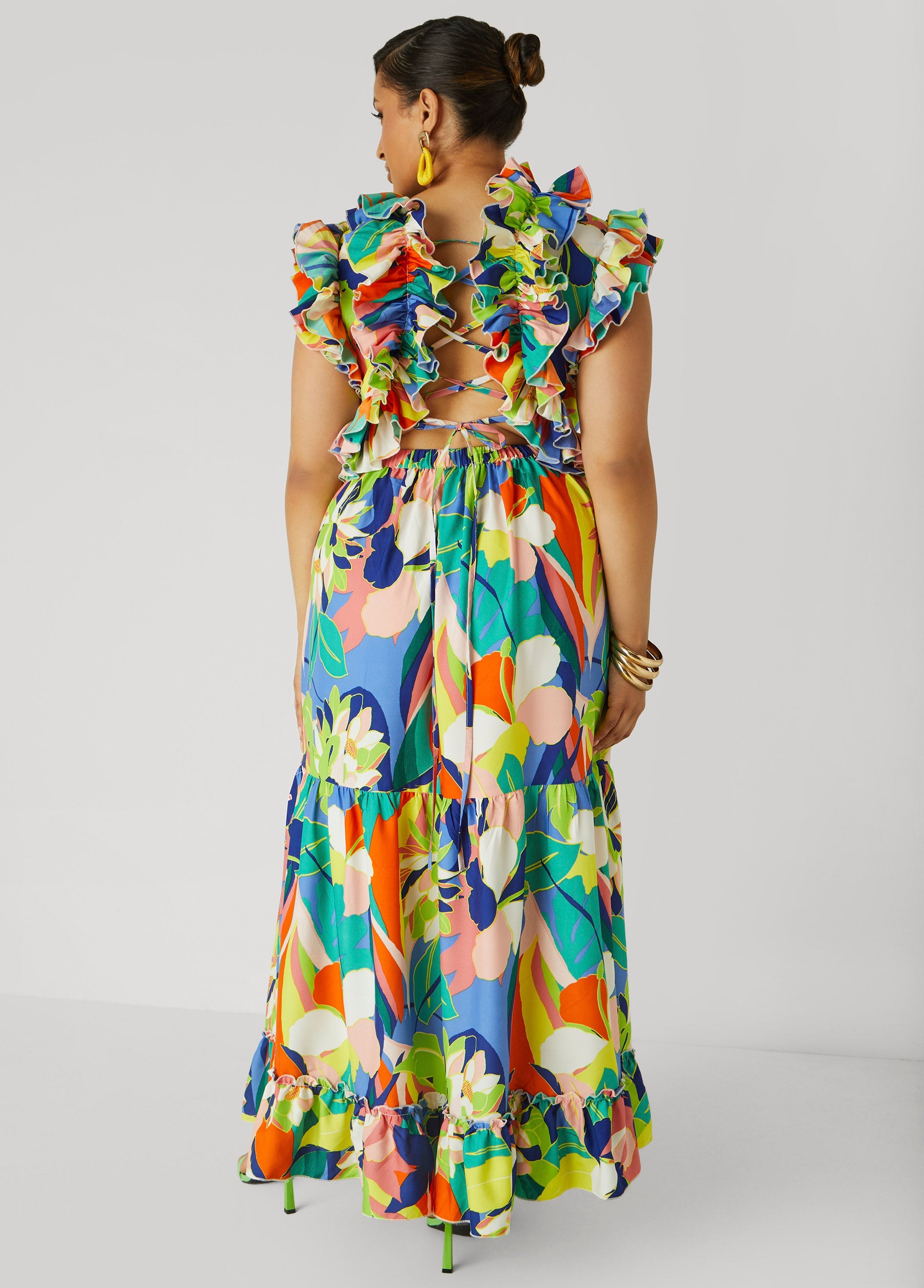 Say it with color in this floral print maxi, featuring vibrant blooms, ruffled trims and a flirty V-neckline. The lace-up open back brings the fun, perfect for sunny days and making an entrance.