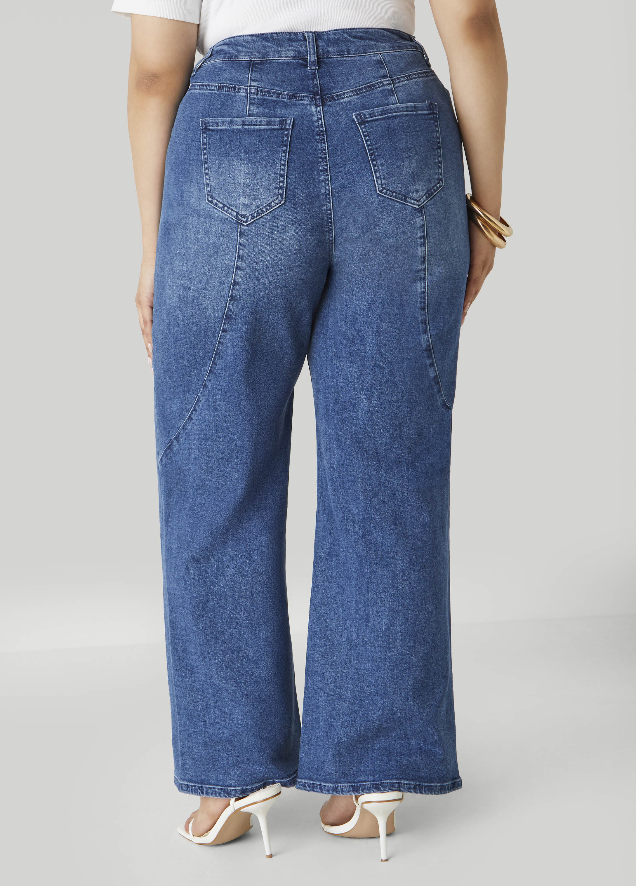 These stretch-denim jeans serve up serious attitude with seam detailing, a high waist and a wide-leg silhouette that does all the talking.