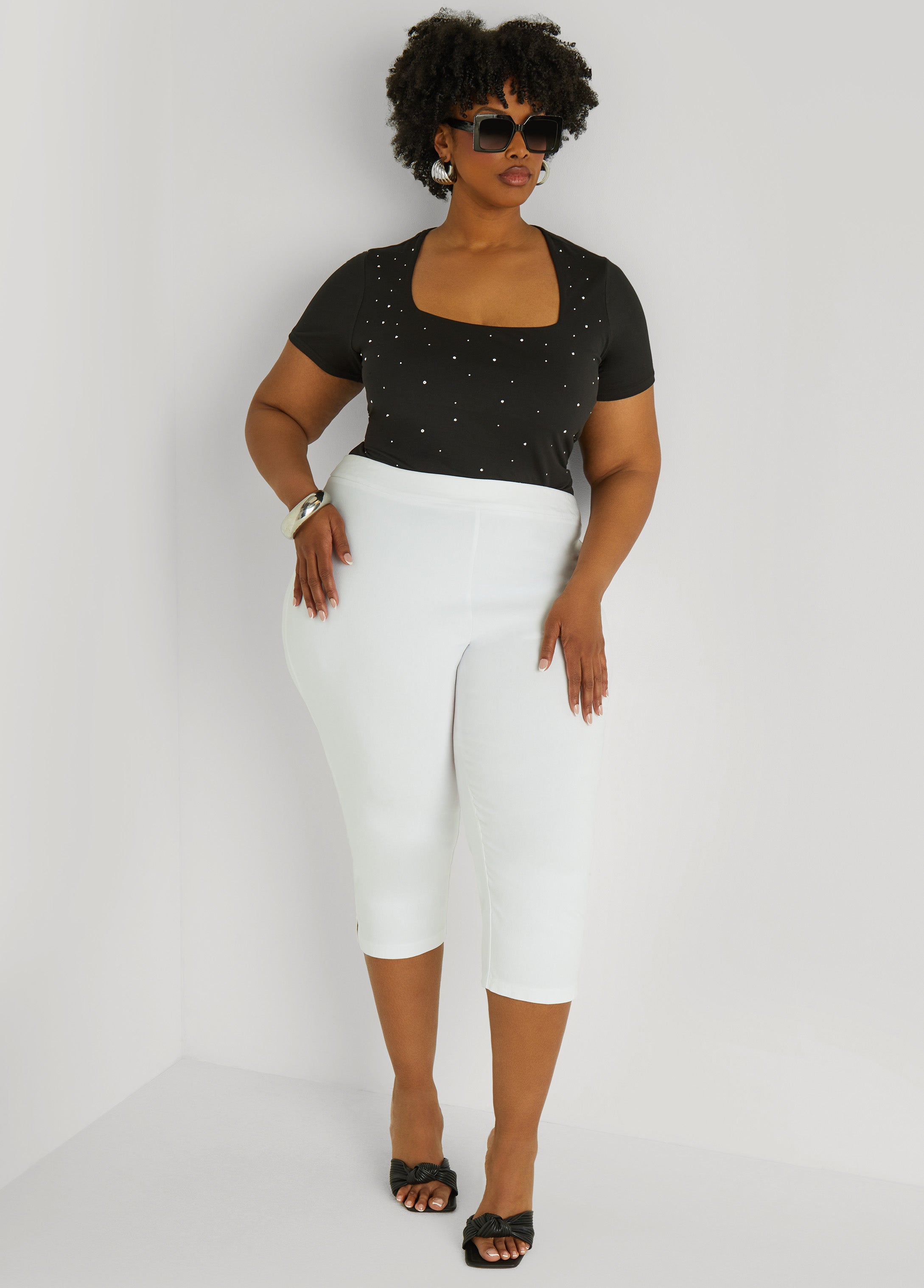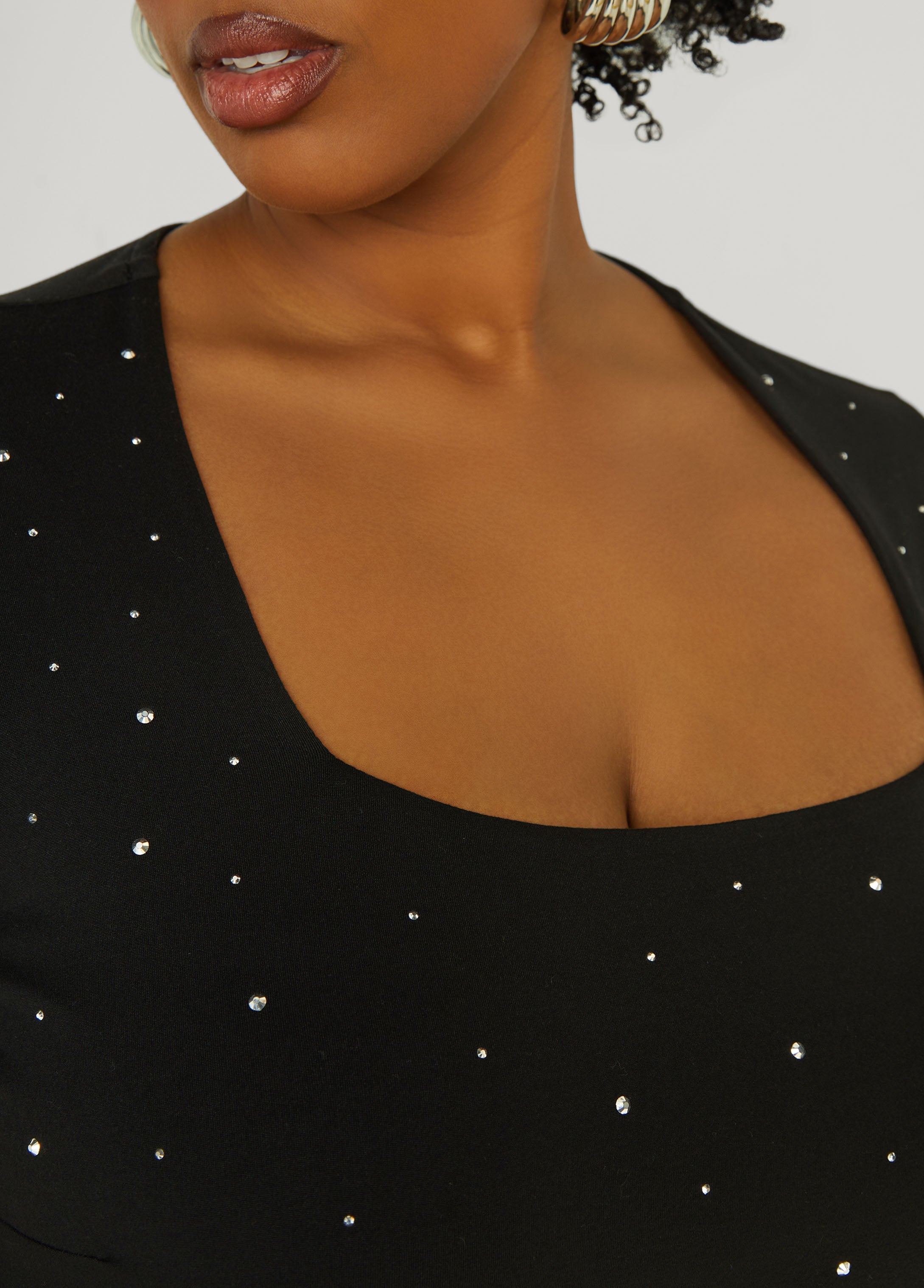 A classic tee, all glowed up. This stretch-knit staple features a square neckline that frames just right, plus crystal detailing that catches the light (and maybe a few stares).