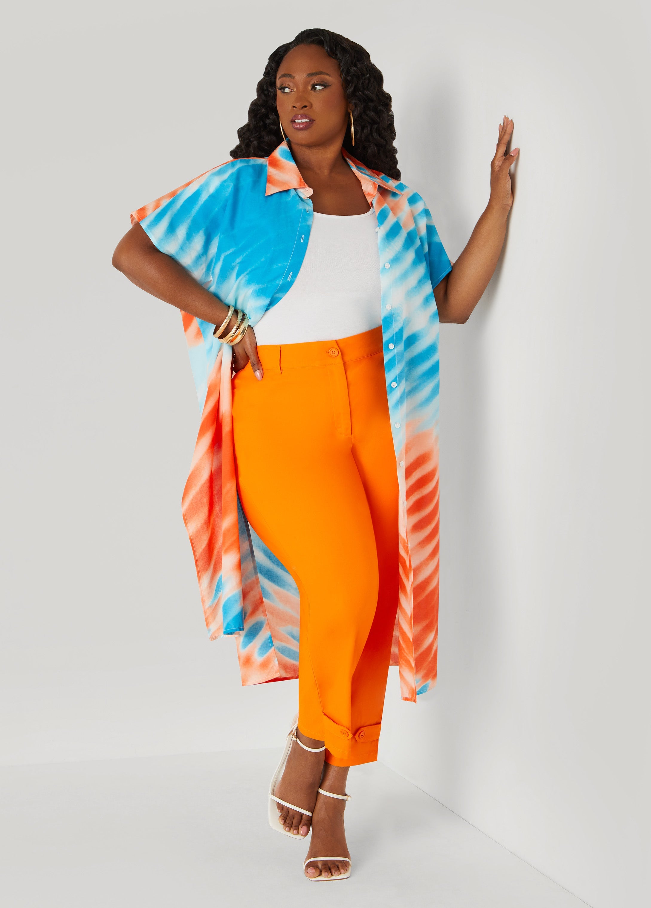 Orange and blue tie-dye goes all in. This cotton duster shirt keeps it long with side splits and a loose fit you can button or wear open. No fuss just color, shape and a little air in the mix.