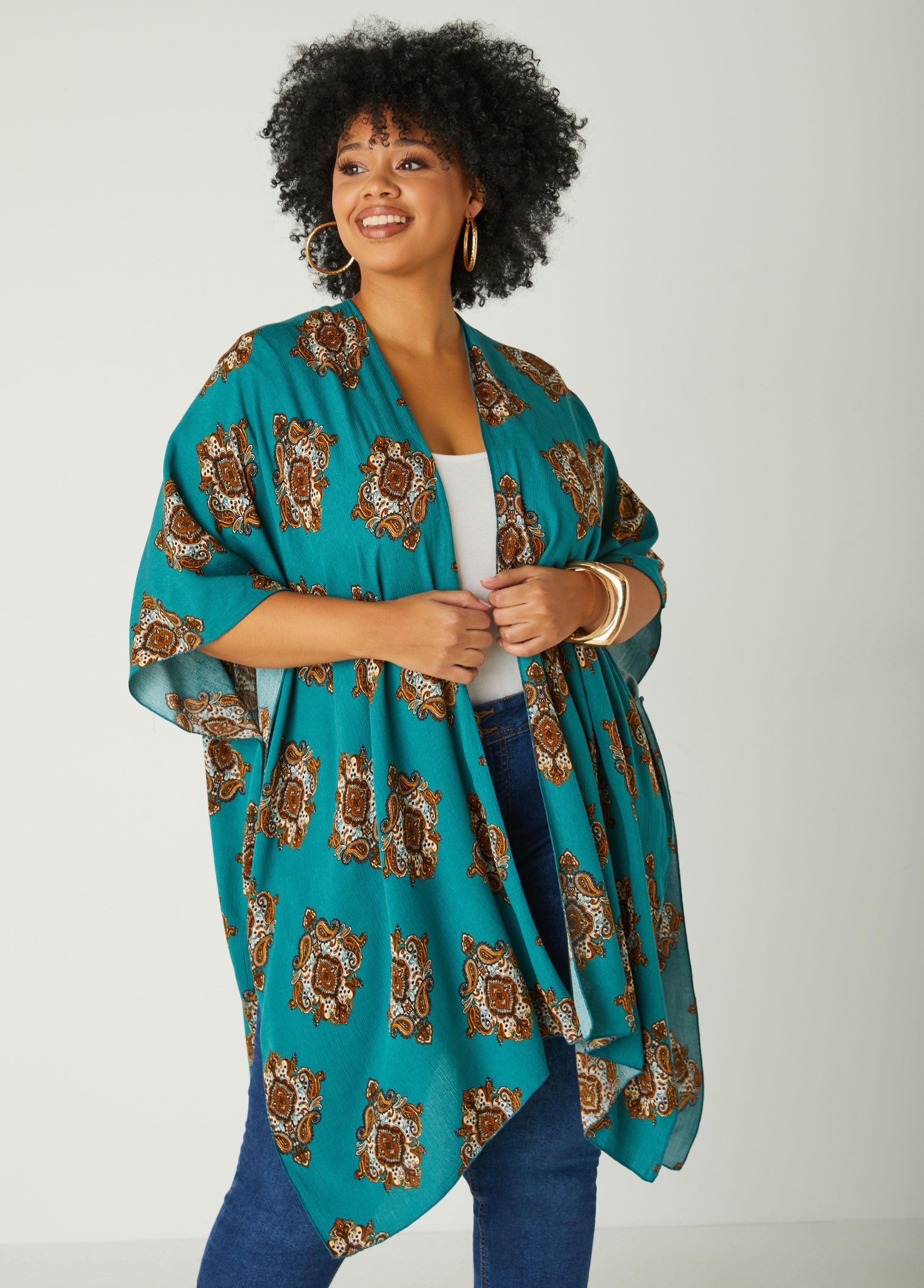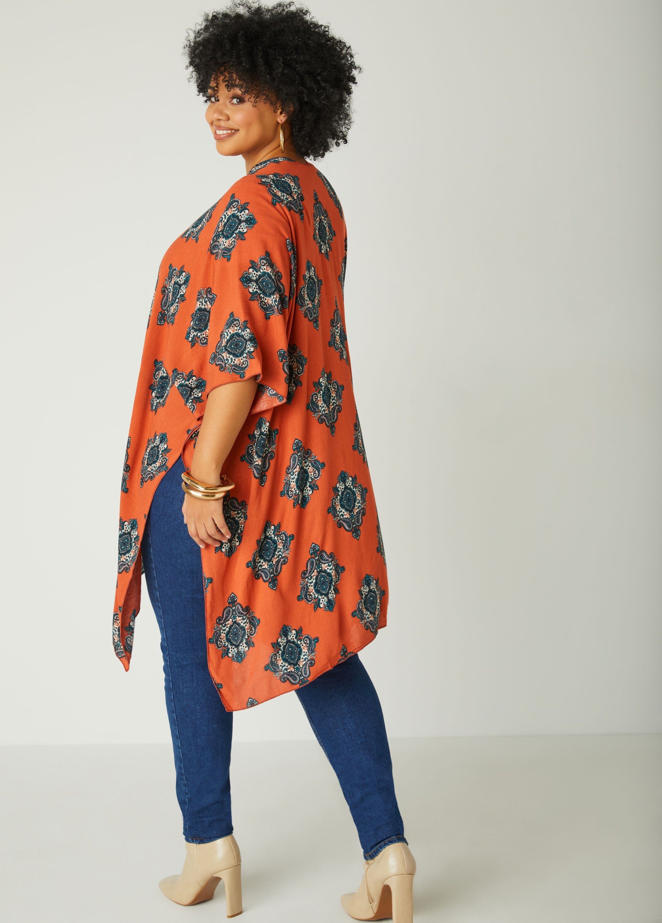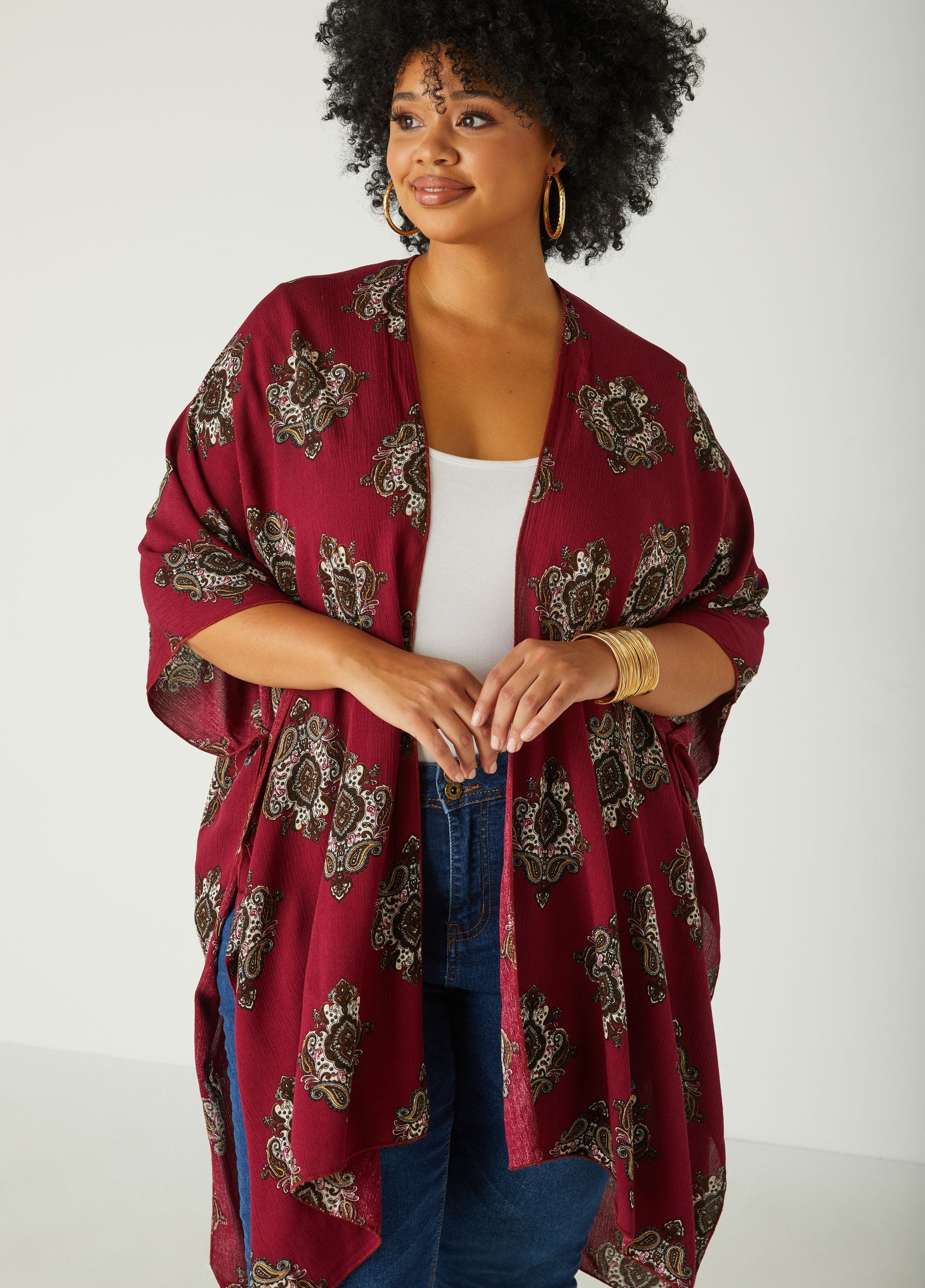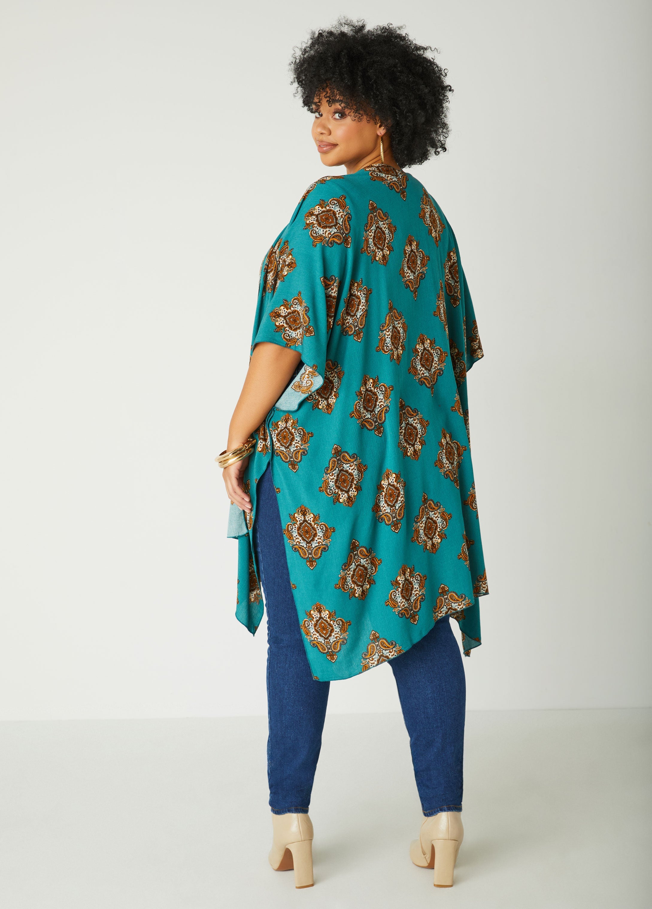 Add a touch of boho charm to your wardrobe with this paisley print woven kimono. The flowing silhouette features splits at the sides and an open front, perfect for layering over your favorite outfits.