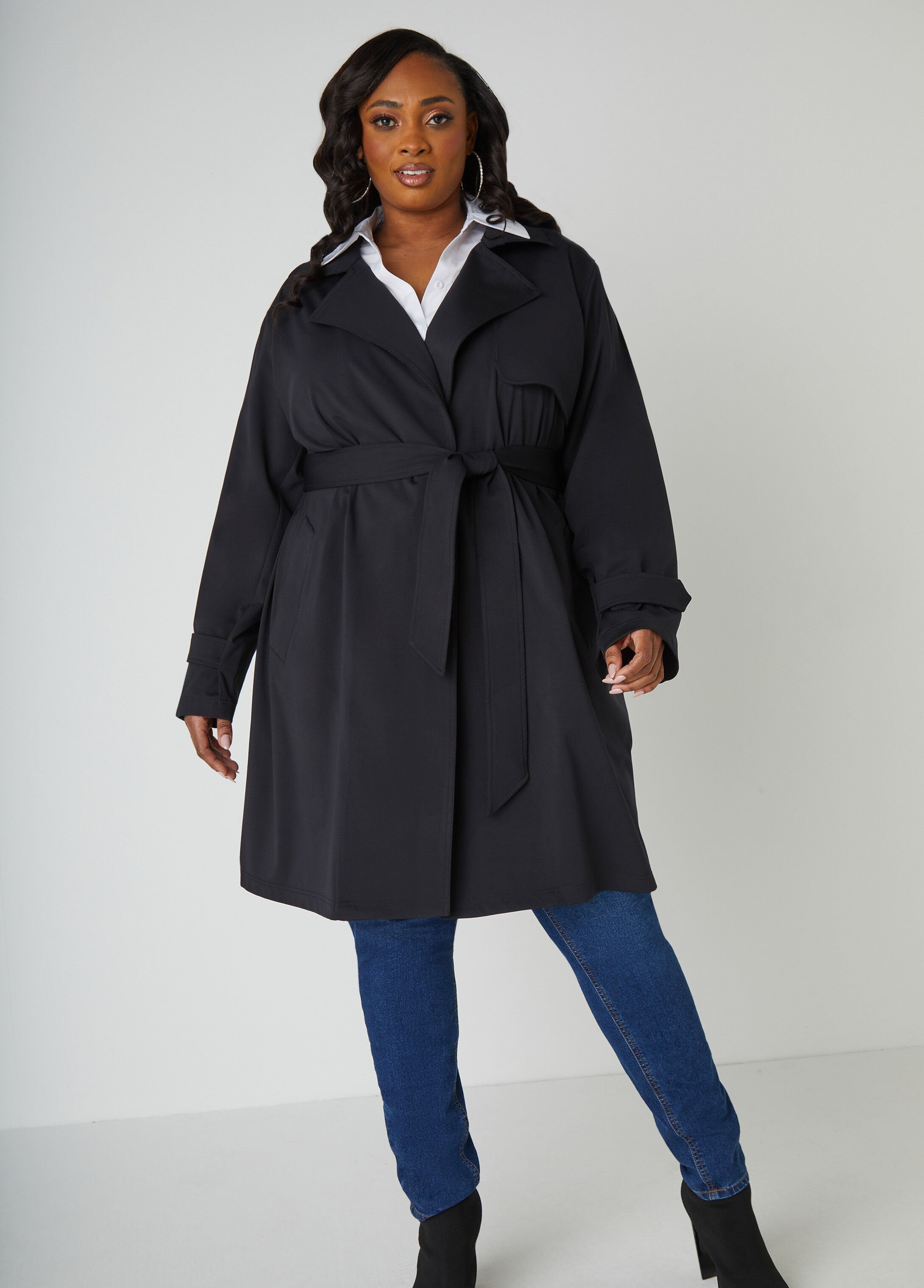 Say hello to your new must-have. This stretch-knit trench coat combines comfort with polish, featuring snap-fastening sleeve cuffs and a shirred waistband for a flattering fit. Two welt pockets keep your essentials close, while the tie waist lets you define your silhouette your way.