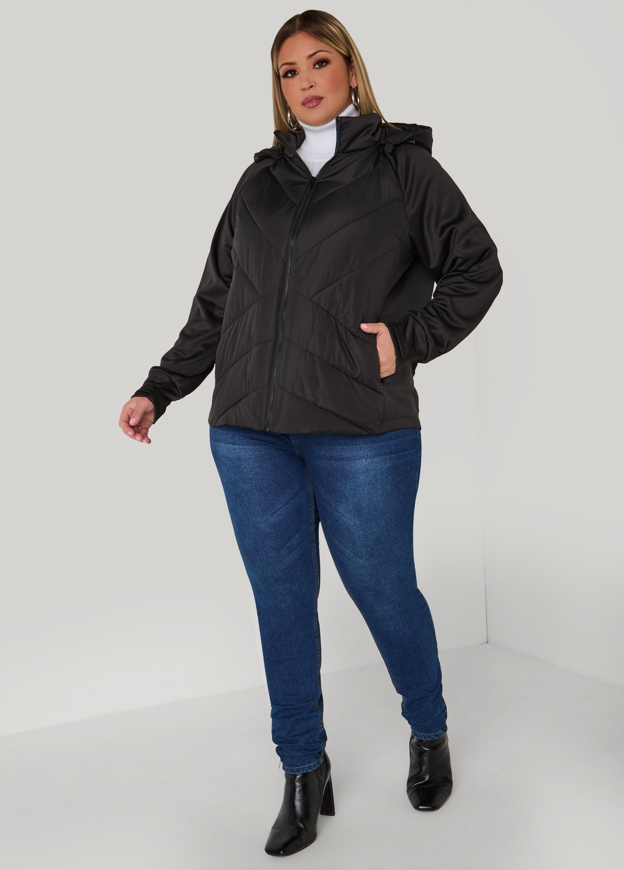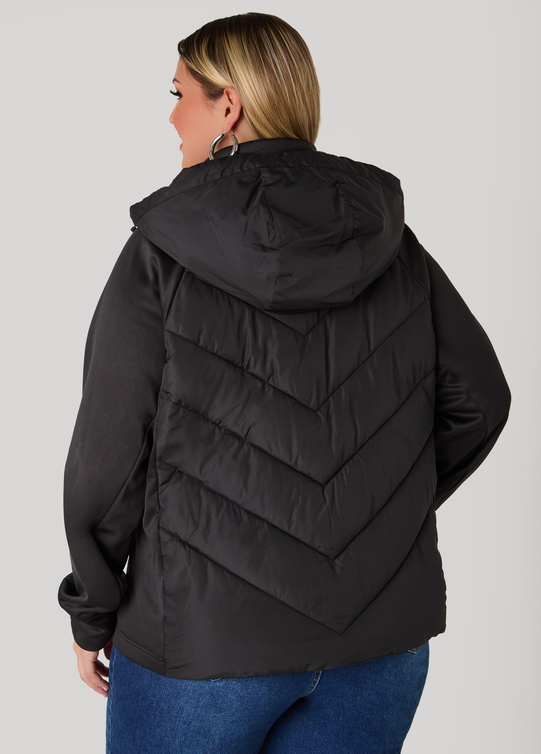 Quilted is sporty-chic in this jacket featuring a detachable drawstring hood, zip pockets, and stretch-knit panels that's modern & layer-ready.