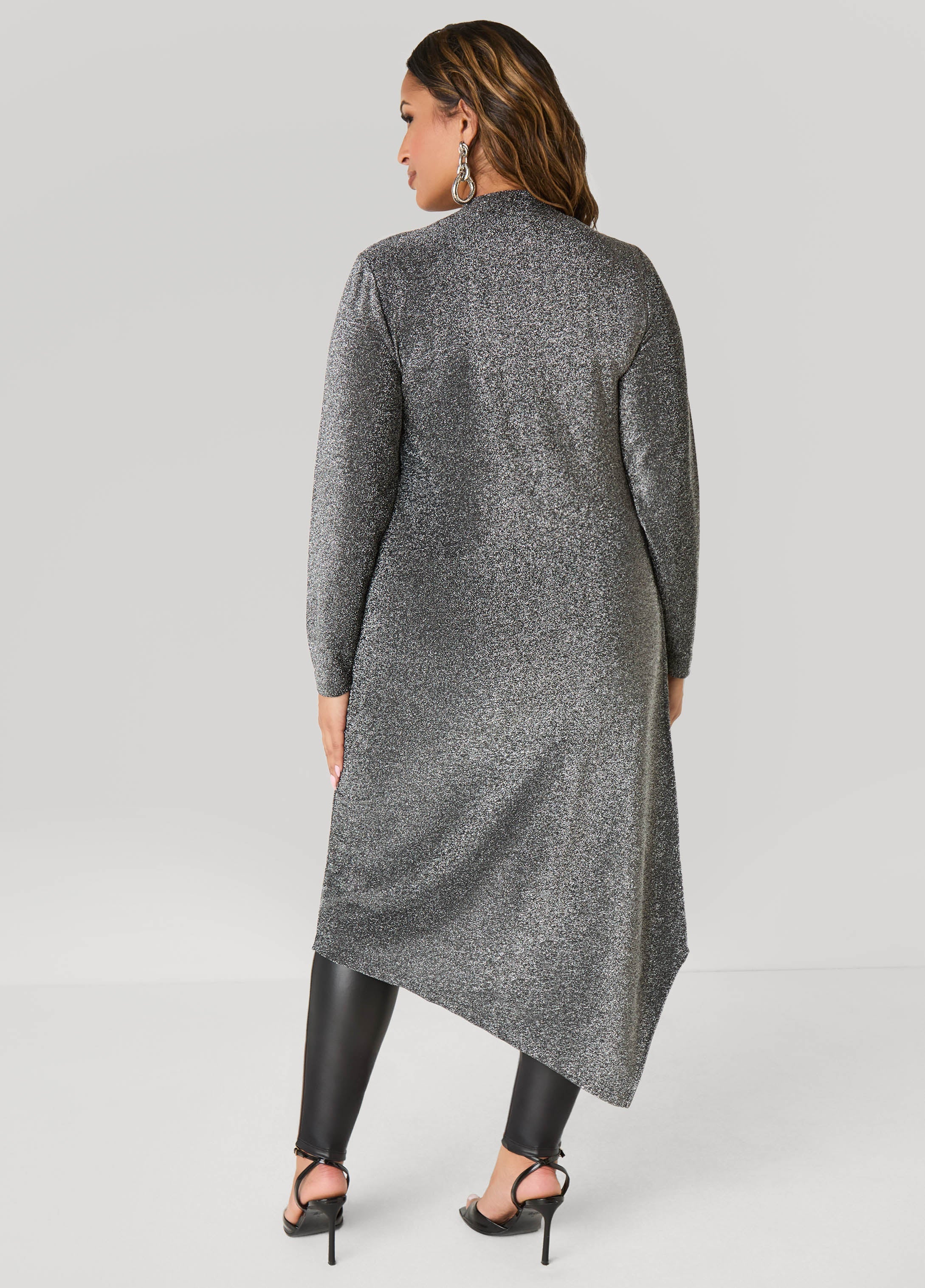 Glide into this stretch-knit duster with silver threading that catches every & is easy on the eye. Side splits and an asymmetric hem keep it moving with attitude while you own the room.