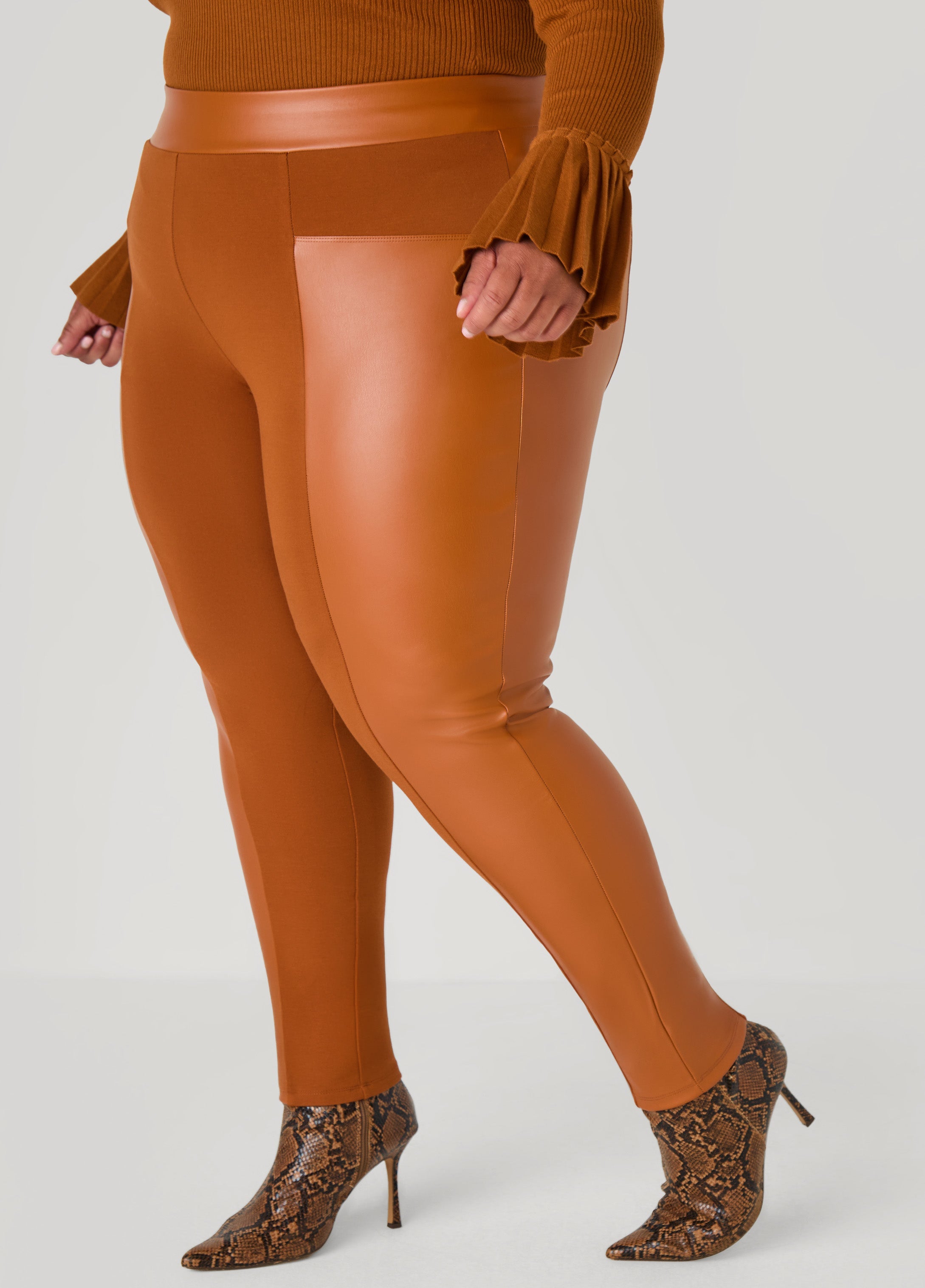 These sleek leggings are styled in a body-hugging ponte that sculpts your curve with the added faux leather panels to elevate the look.