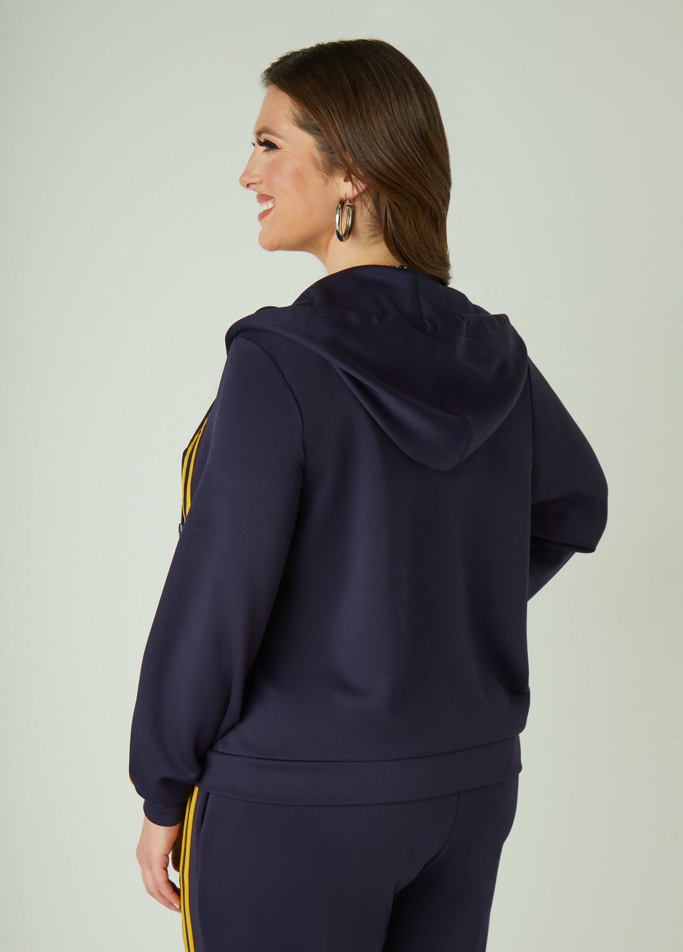 Update your off-duty look with this stretch-knit track jacket, the perfect blend of comfort and style. Featuring a drawstring hood for a custom fit, striped trims for a sporty touch, and two front patch pockets to keep essentials close, this jacket is as practical as it is sleek. Pair it with the matching joggers for a coordinated set that’s effortlessly cool, whether you're lounging or on the move.