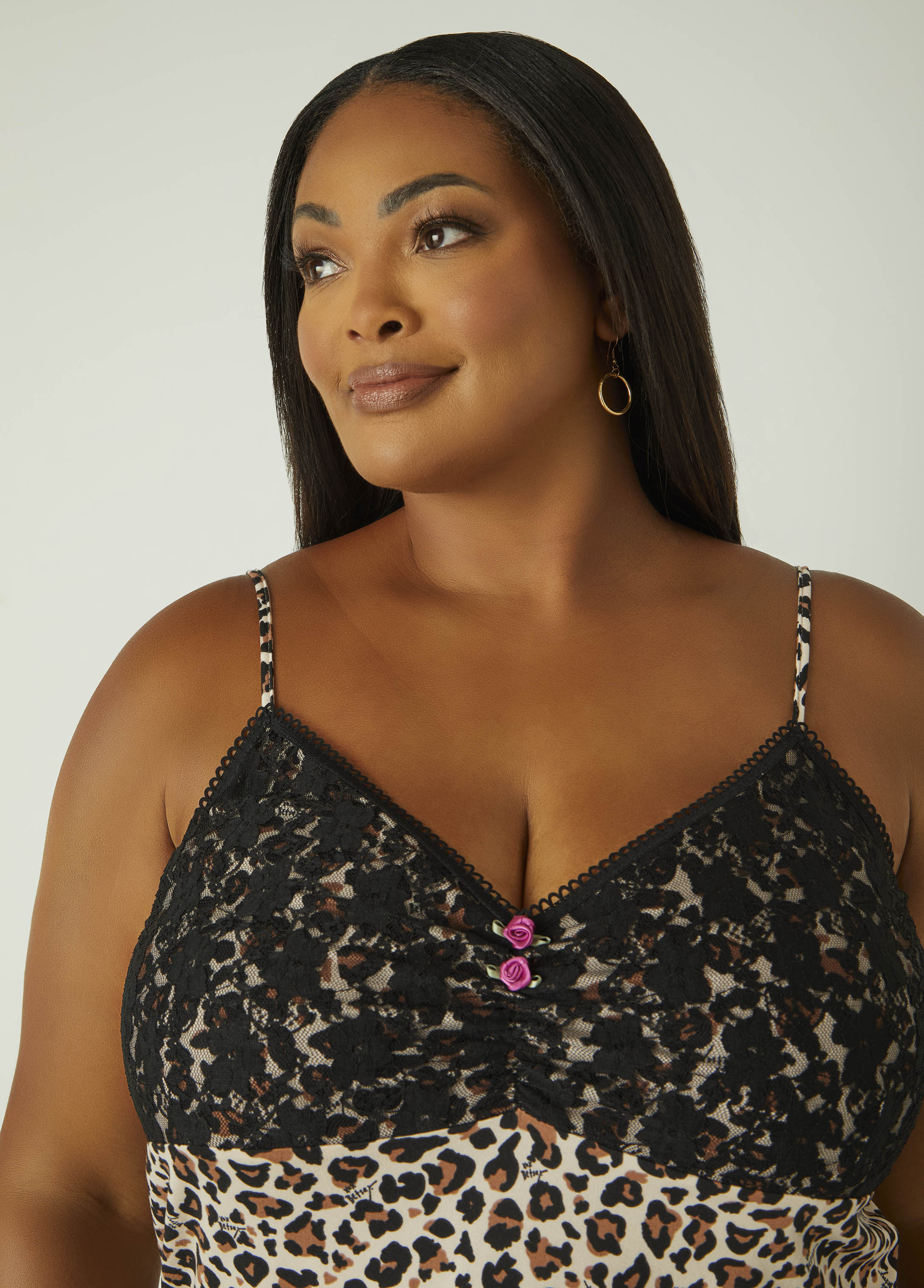 Prowl into bedtime in this Betsey Johnson leopard print pajama set. The cami brings lace panels, rosettes and flirty loop trims while the matching drawstring shorts keep it cute and comfy. Wild nights start here.