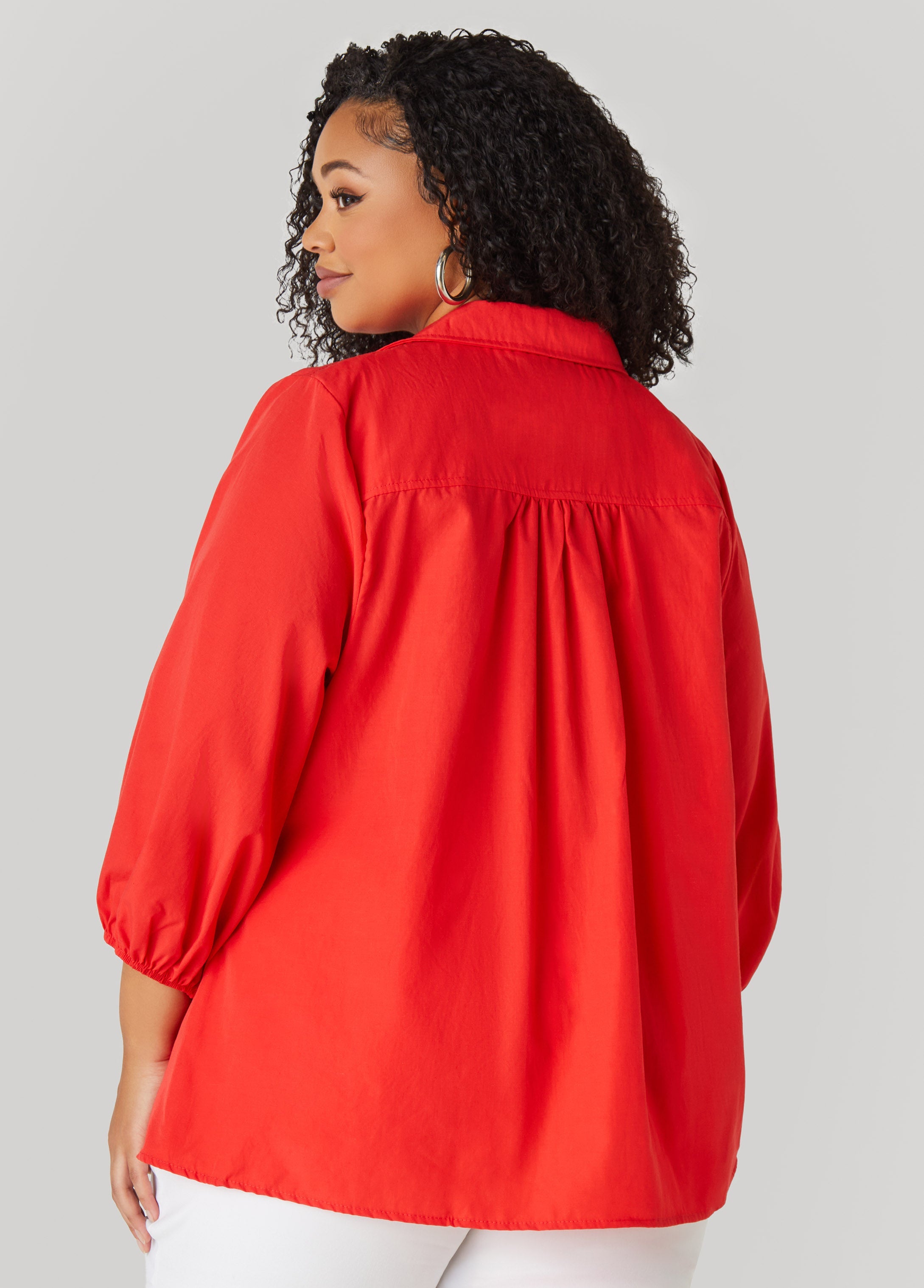 Serving shape and style. This cotton-blend blouse brings the drama with a deep V, smocked bodice and puff sleeves with stretch cuffs.