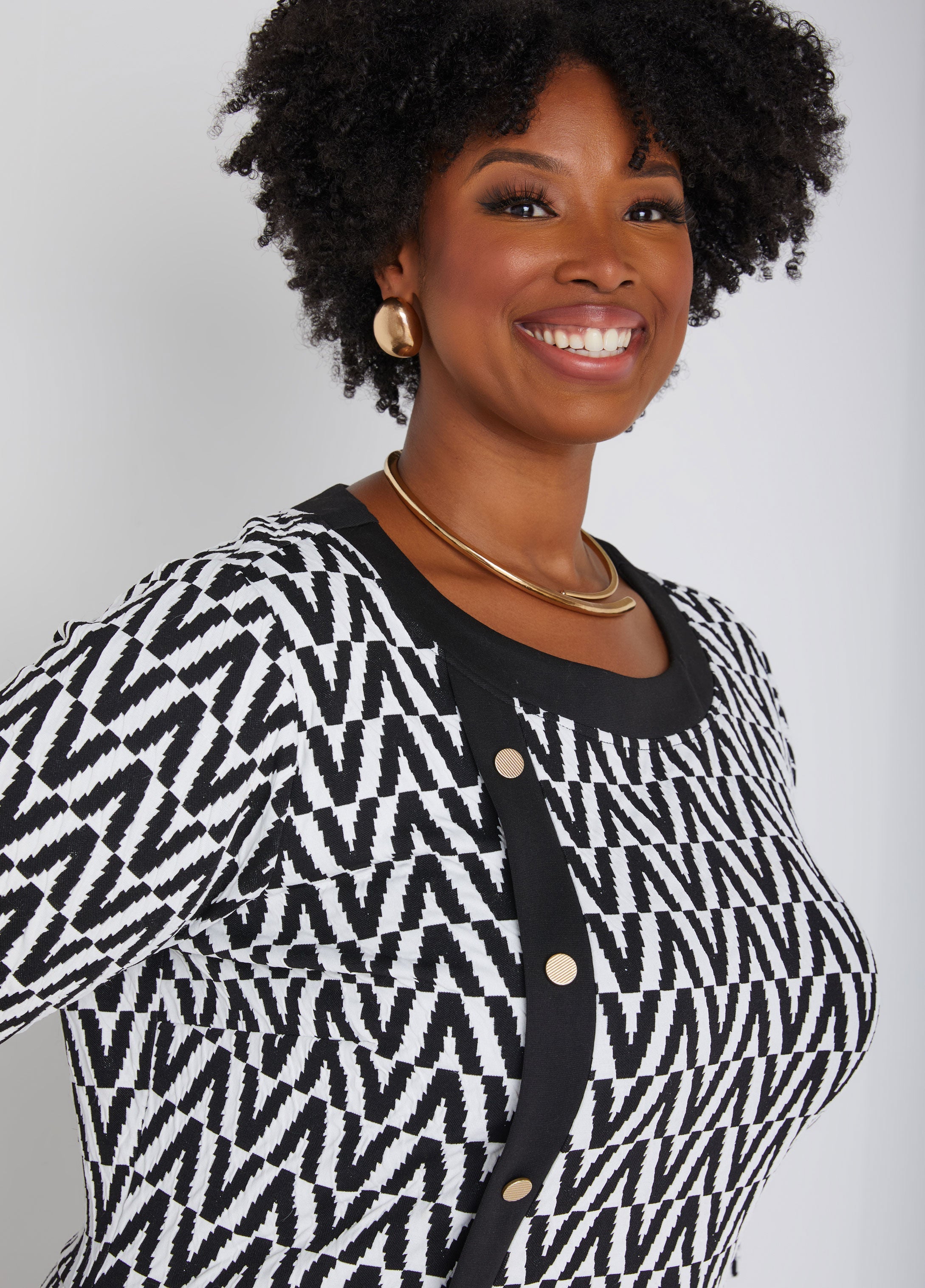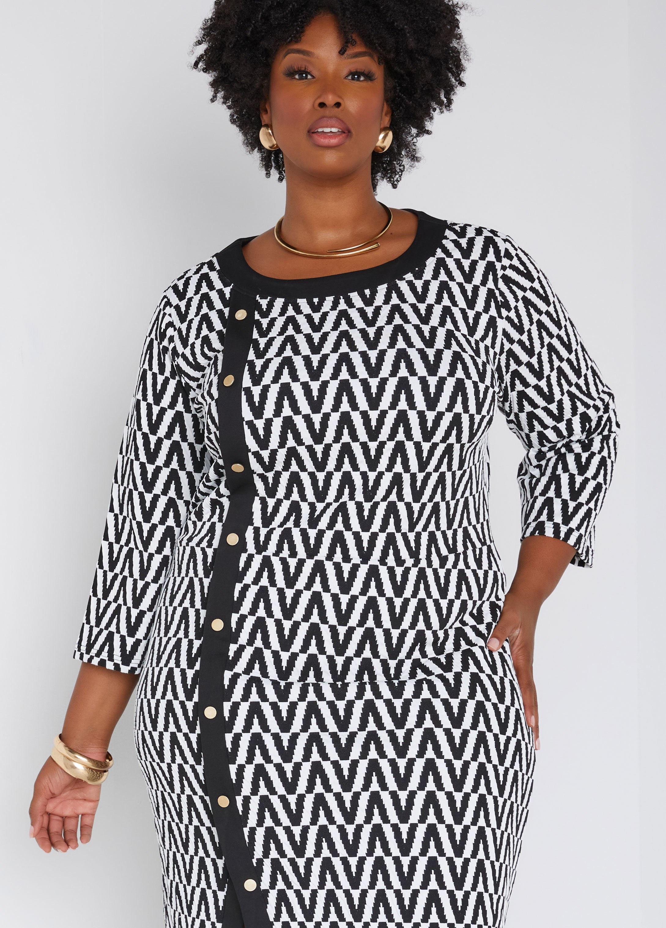 Step up your style game with this textured-knit midi sheath dress. The bold geometric pattern adds a modern edge, while the sleek sheath silhouette flatters your figure in all the right places. Eye-catching button detailing down the front adds a touch of elegance, leading to a subtle split that gives this dress just the right amount of flirt. Perfect for a day-to-night look, this statement piece pairs effortlessly with strappy heels or ankle boots for a trendy, polished finish.