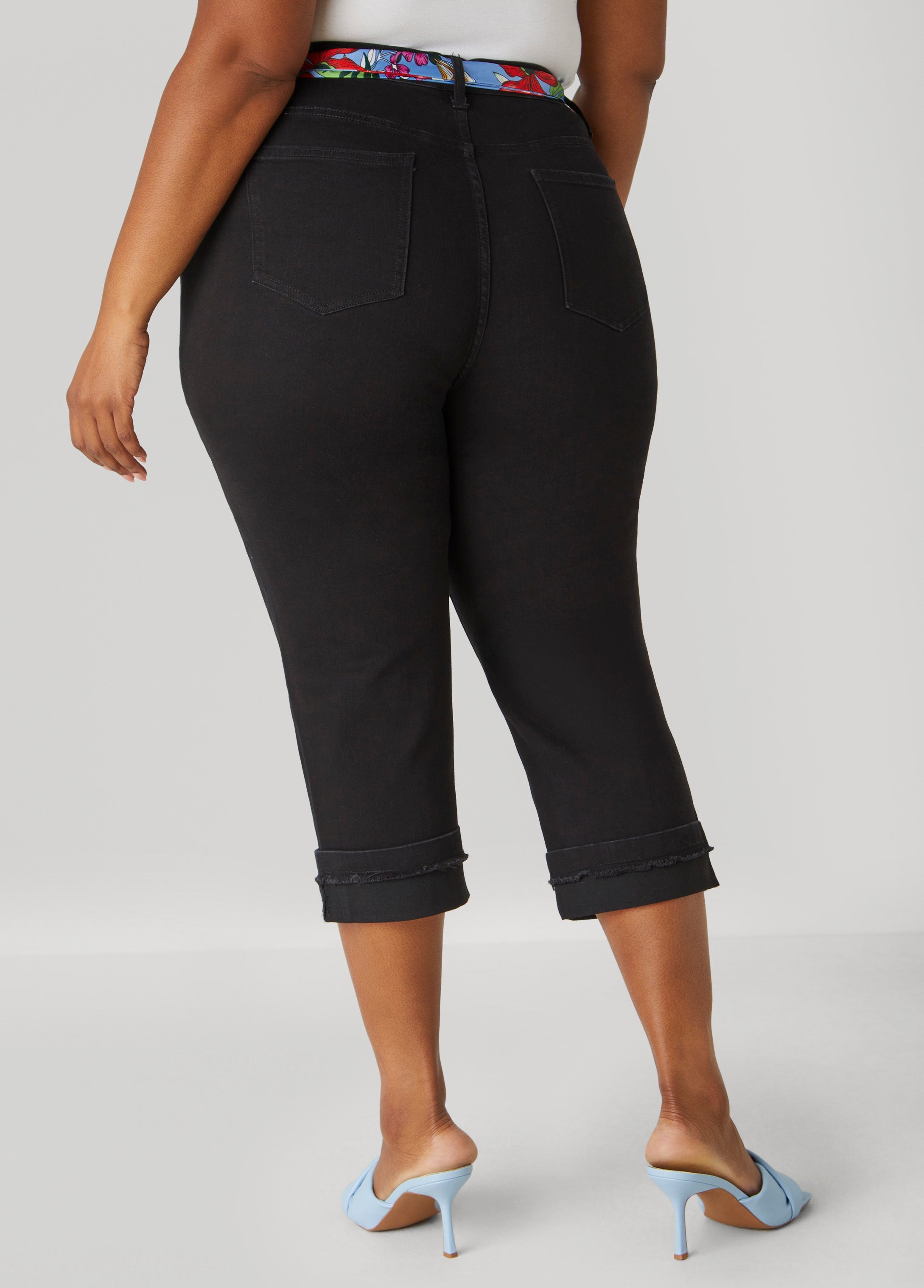 Turn up the style dial with these high-rise denim capris! The printed satin scarf belt incorporates a fun pop of color while the cuffed hemline keeps it polished and playful.