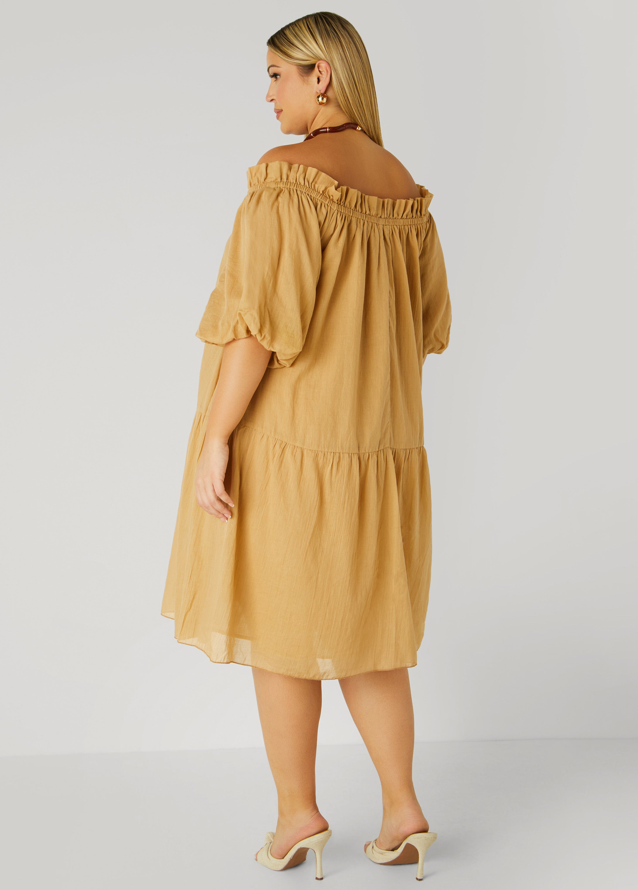 This off-the-shoulder cotton-gauze dress stuns with ruffled trims, puffed sleeves and stretchy details that keep it comfy all day. Light, airy and made for warm-weather fun.