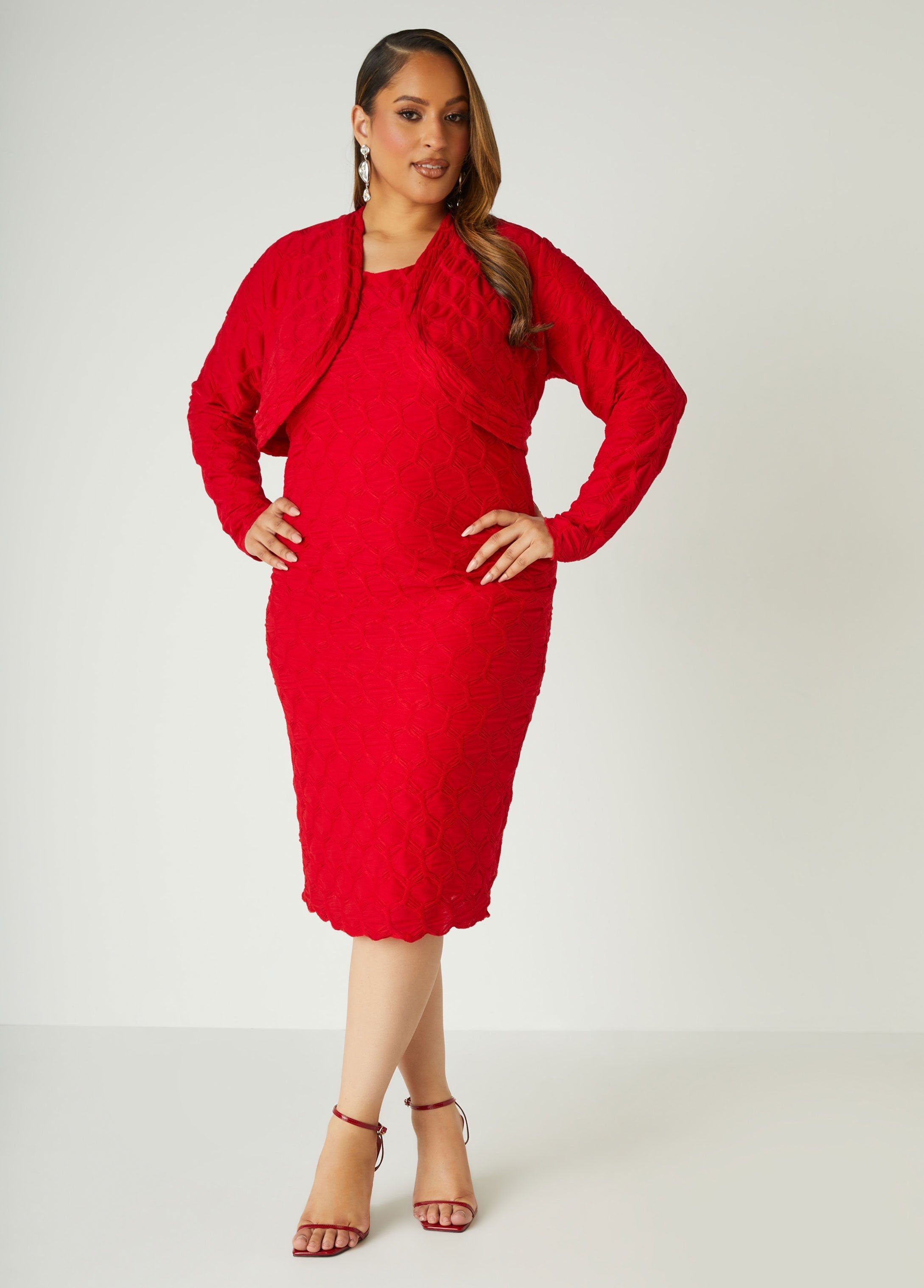 Indulge in luxury with this textured-knit dress, fully lined in smooth stretch-knit for an ultra-comfortable, flattering fit. Its versatile design allows it to be effortlessly worn as a two-piece set with the matching bolero, adding an air of sophistication to any occasion. A timeless piece that marries elegance with effortless style.