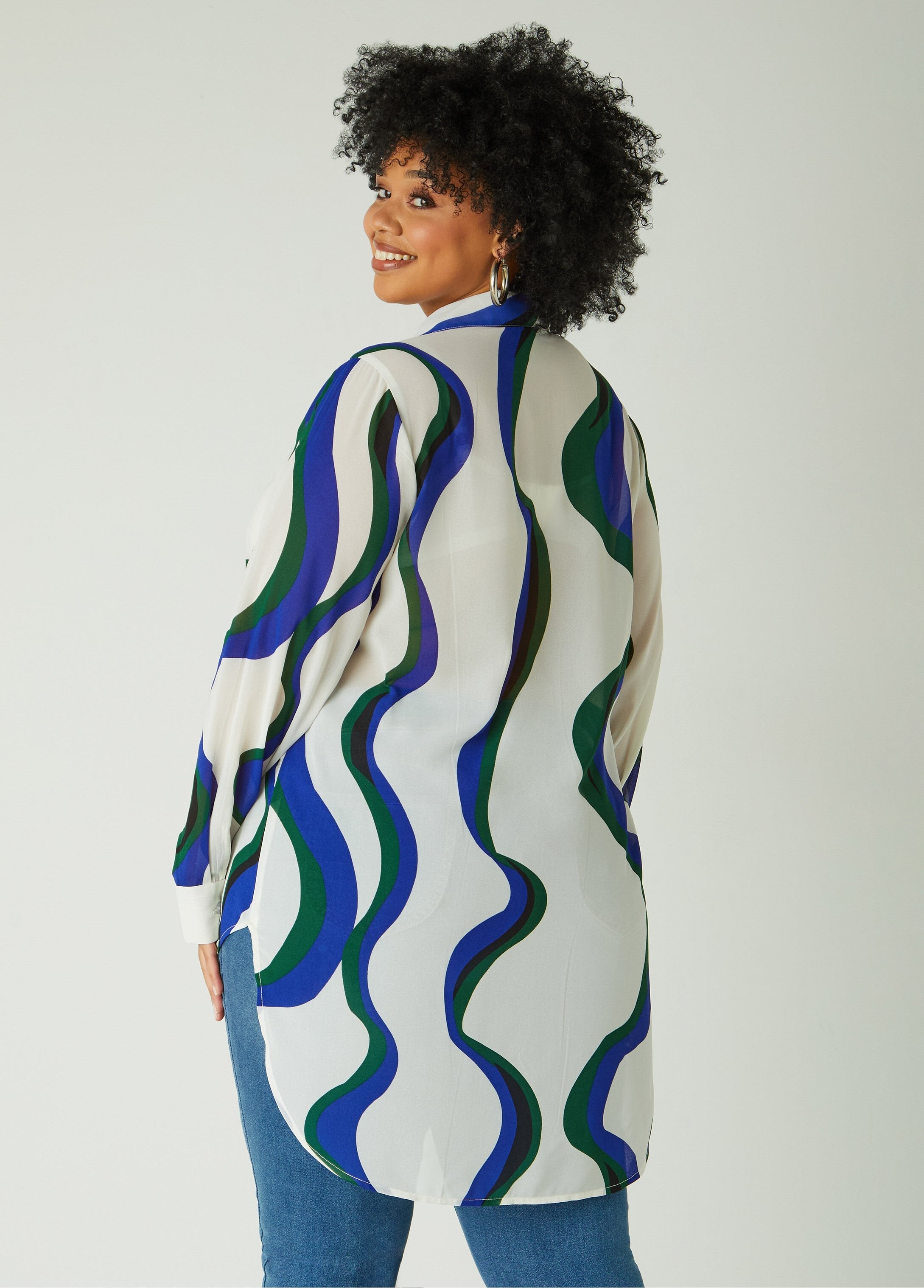 Make waves with this standout crepe shirt! Featuring an eye-catching wave print & a chic hi-low hemline, this design blends style with ease. Pair it with your favorite skinnys for a look that’s effortlessly cool and ready to turn heads.