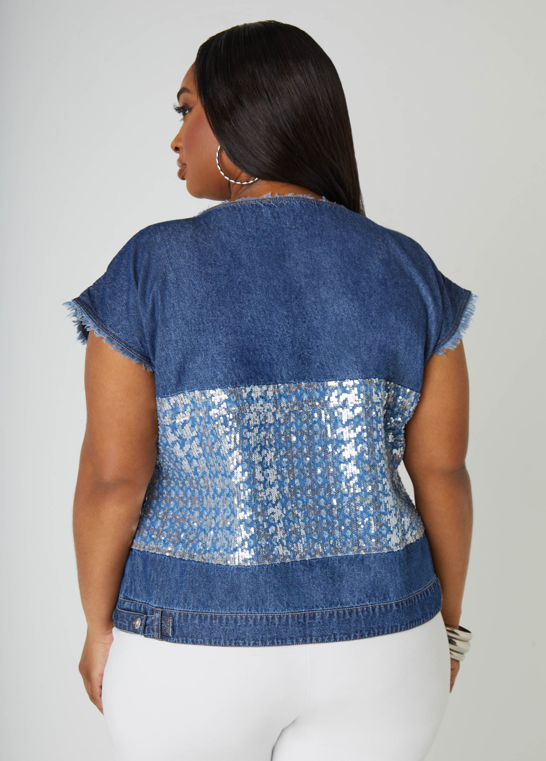 Take your denim game to new heights. This shirt’s distressed light-wash panel & sequin embellishments add the perfect touch of edge, while frayed trims give it that worn-in vibe you crave. Button tabs at the waist let you style it your way—whether you’re showing off or keeping it cool.