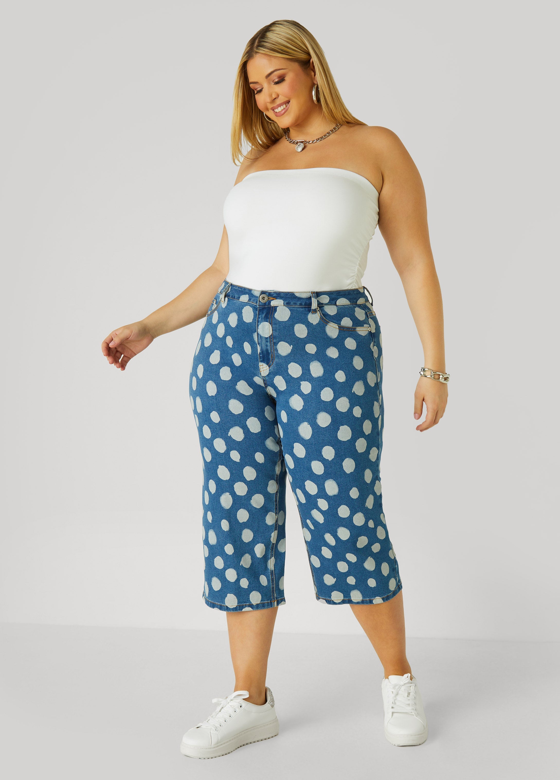 These stretch-denim capris bring fun retro energy, with polka dots that look like they were brushed on in a '60s daydream. The cropped fit keeps it classic with the painted print gives it that lived-in charm.