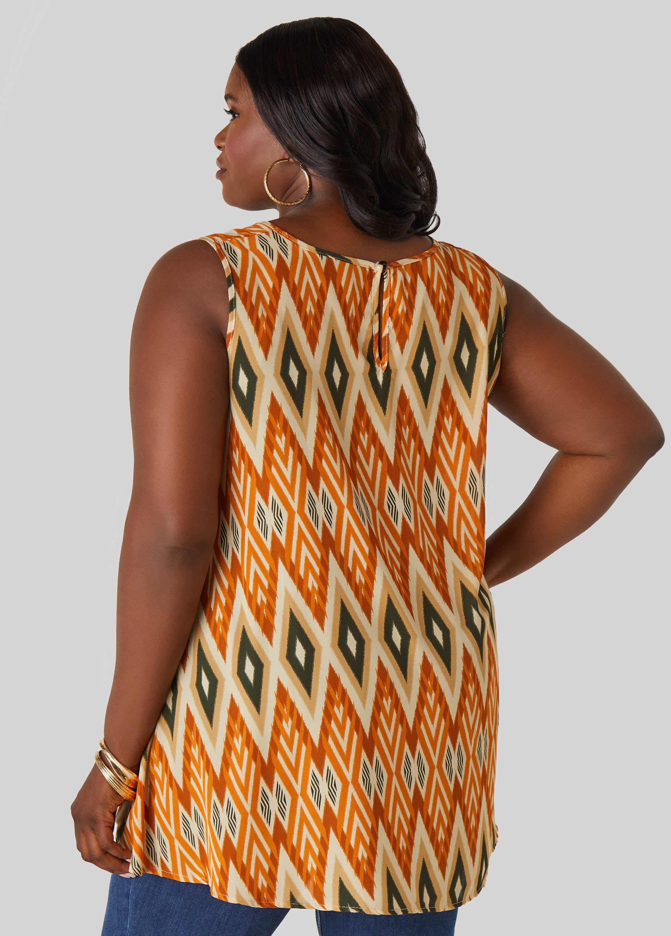 The diamond print of our crepe top add charisma to this warm weather ware complete with a hi-low cut for dimension and coverage.