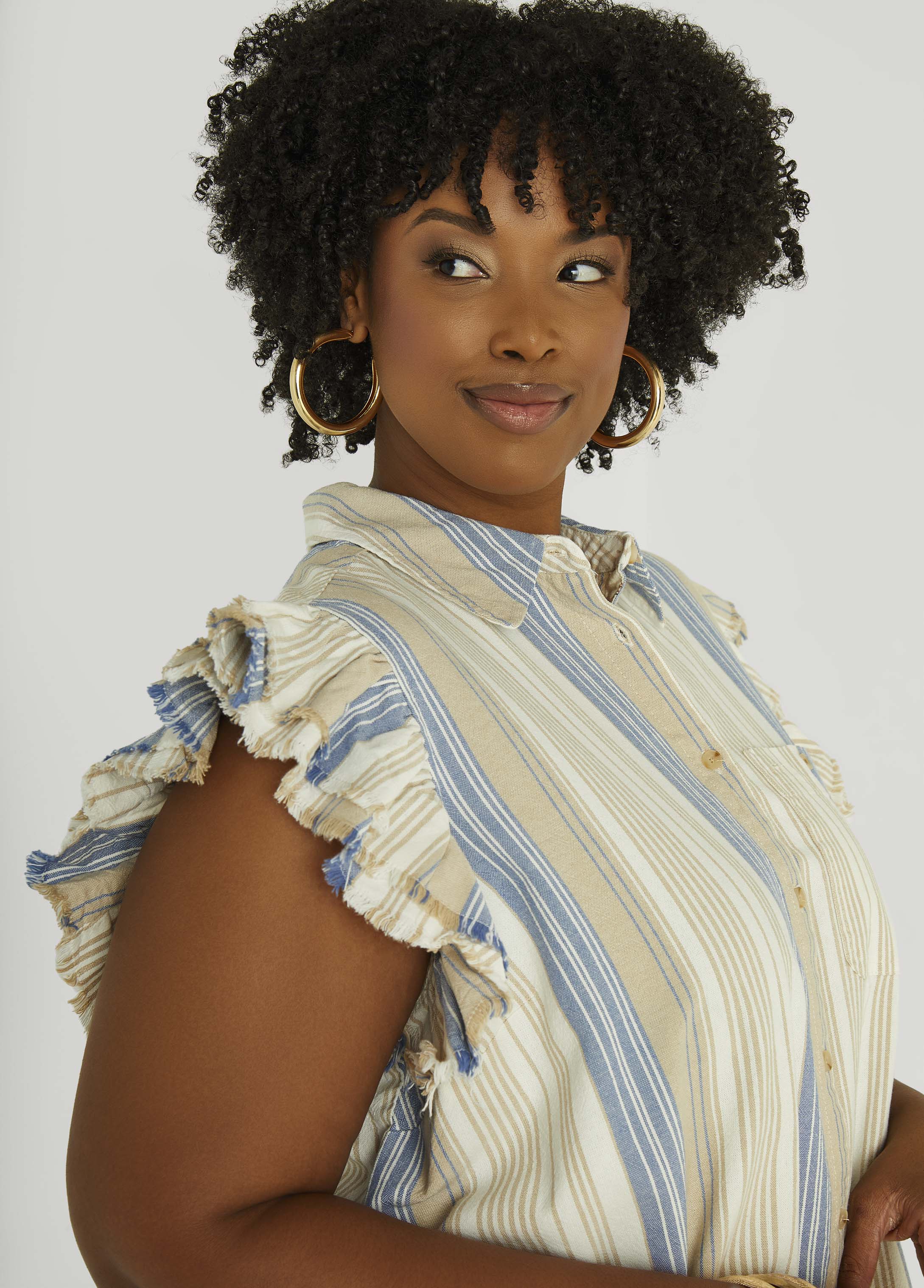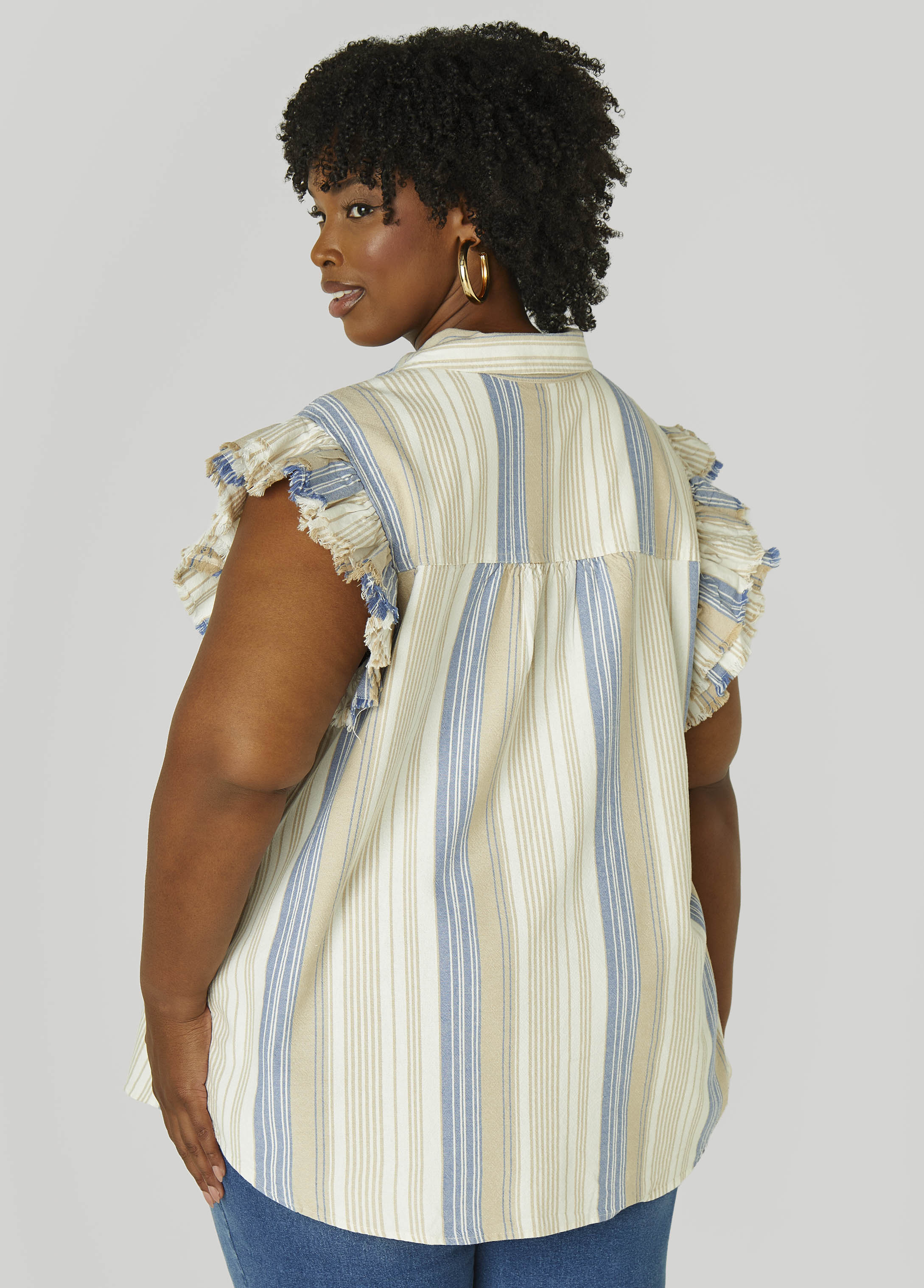 This striped cotton-blend shirt is serving up fun. Tiered ruffle sleeves bring the bounce, the patch pocket keeps things convenient & frayed trims give it that worn-in wink.
