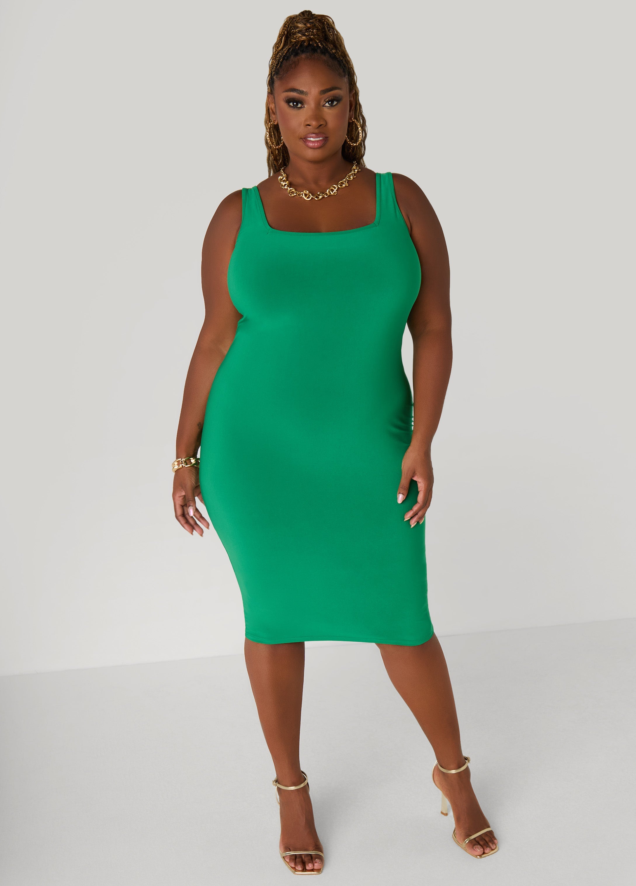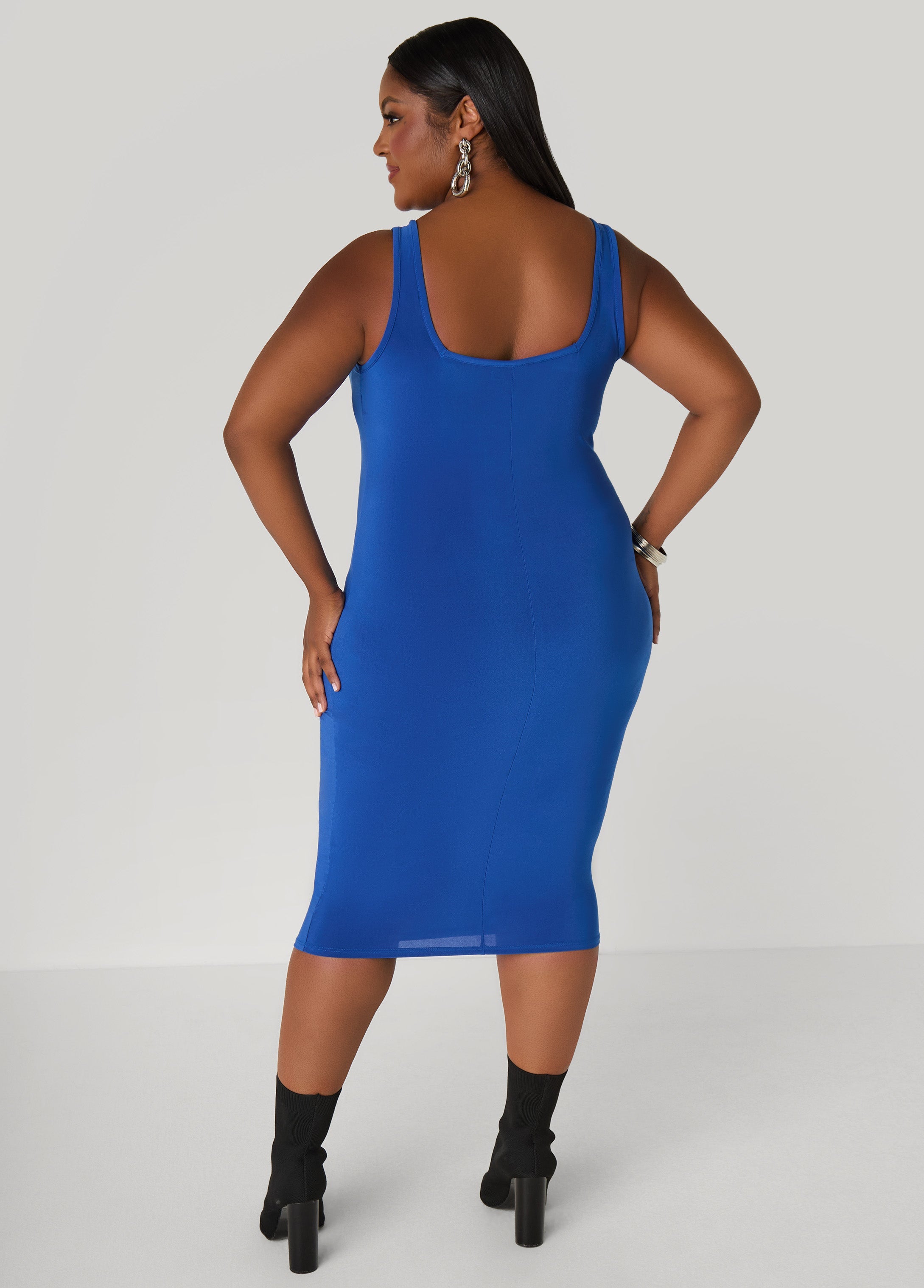 Square neckline, midi length, stretchy, easy fit everyday. Rock this sexy bodycon dress solo or grab the matching duster when you’re feeling like a full set kind of queen.