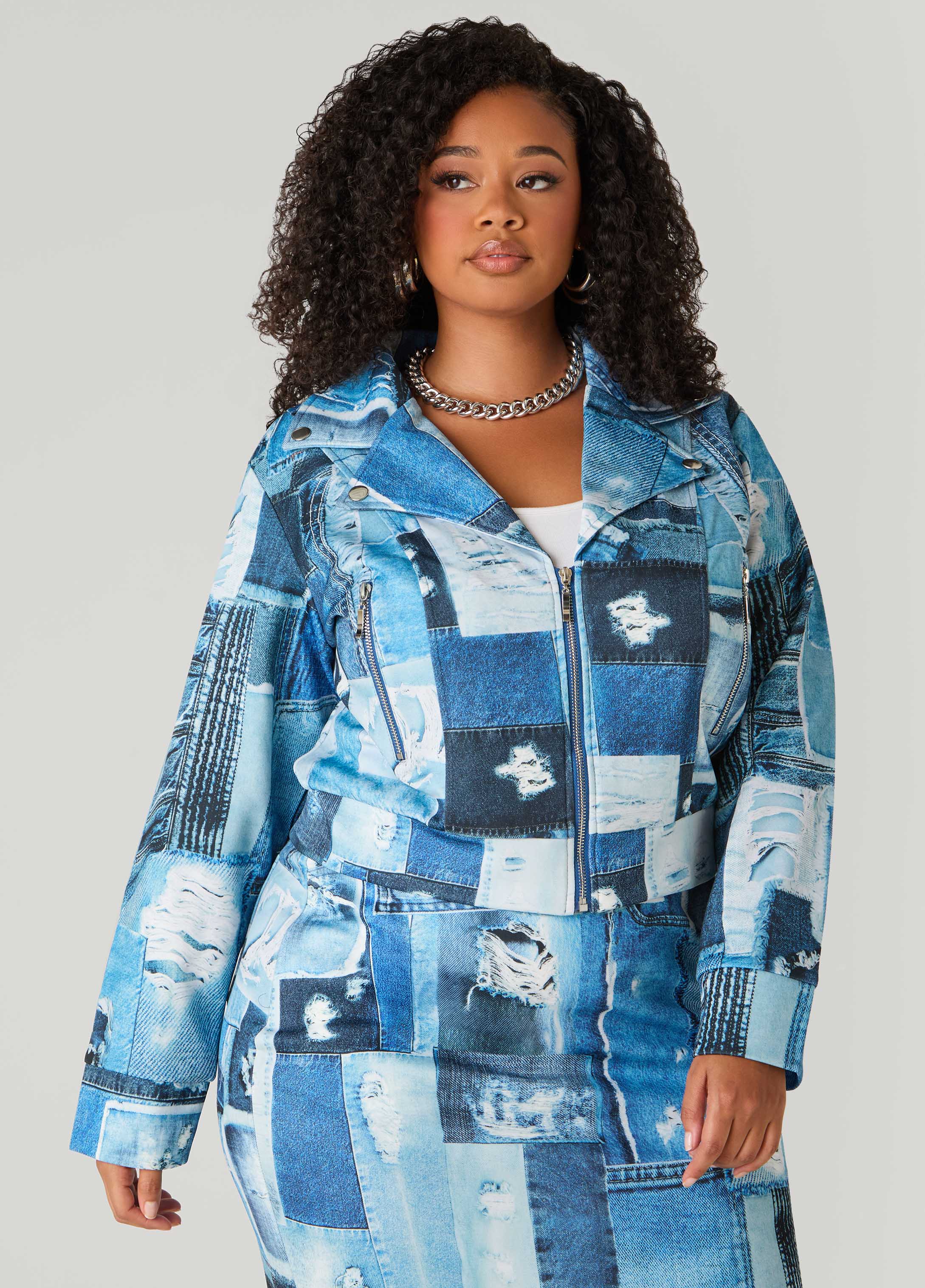 Rev it up in this patchwork denim-print scuba moto jacket, all zipped, snapped and ready to stunt with moto details that do the most. Rock it with the matching skirt when you're feeling fast and fashion-forward.