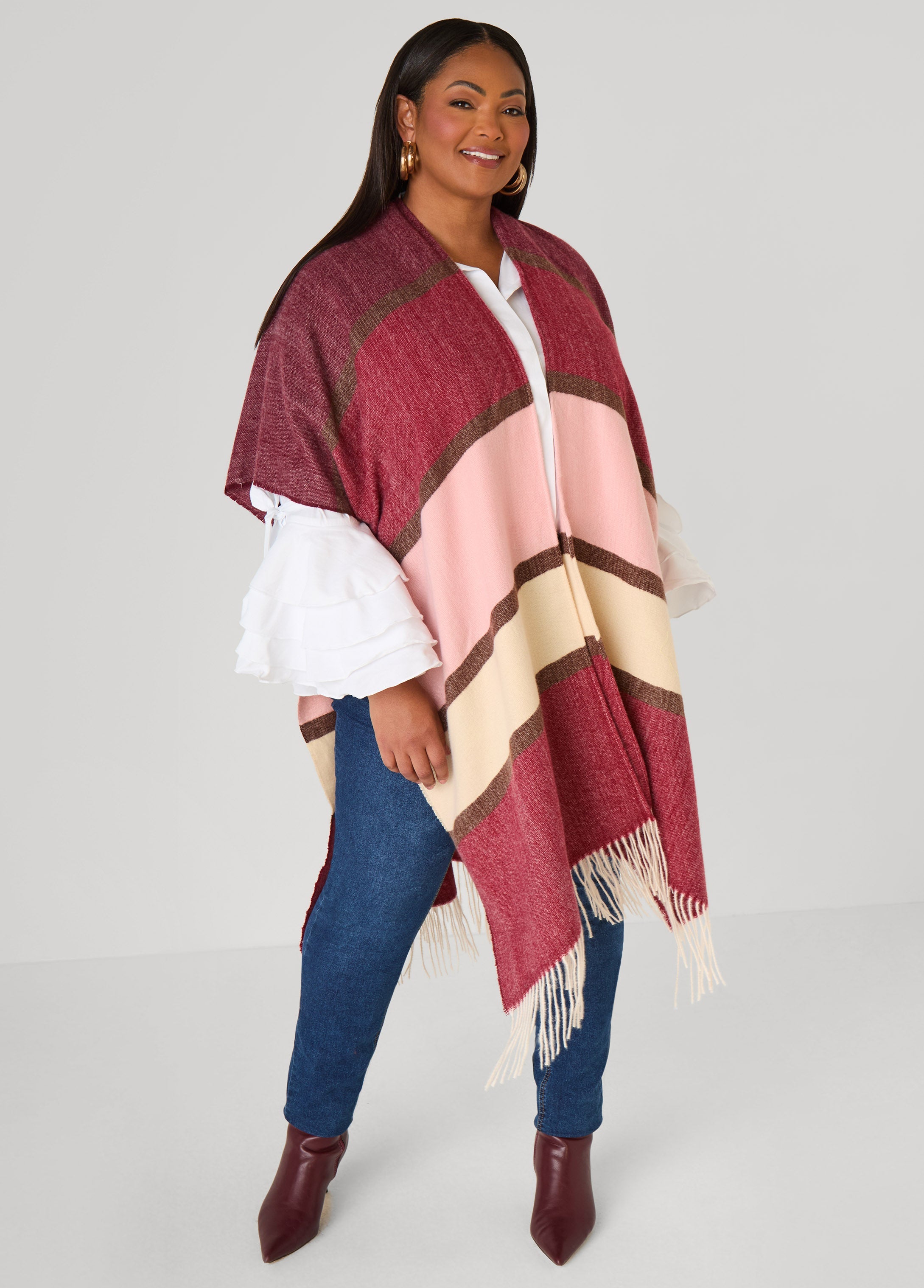 Our kimono is designed with a colorblocked pattern made from soft brushed knit, a perfect layer for those chilly Fall nights.