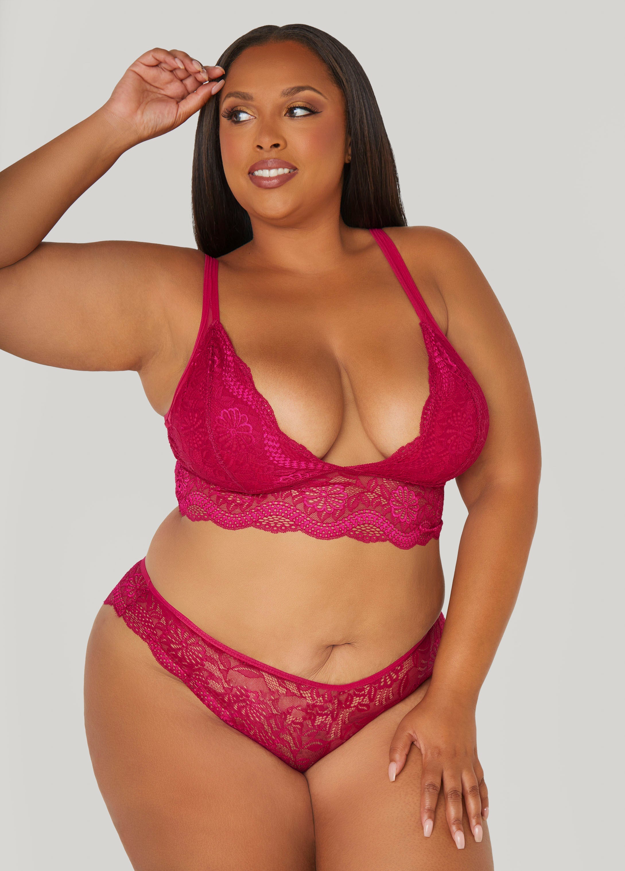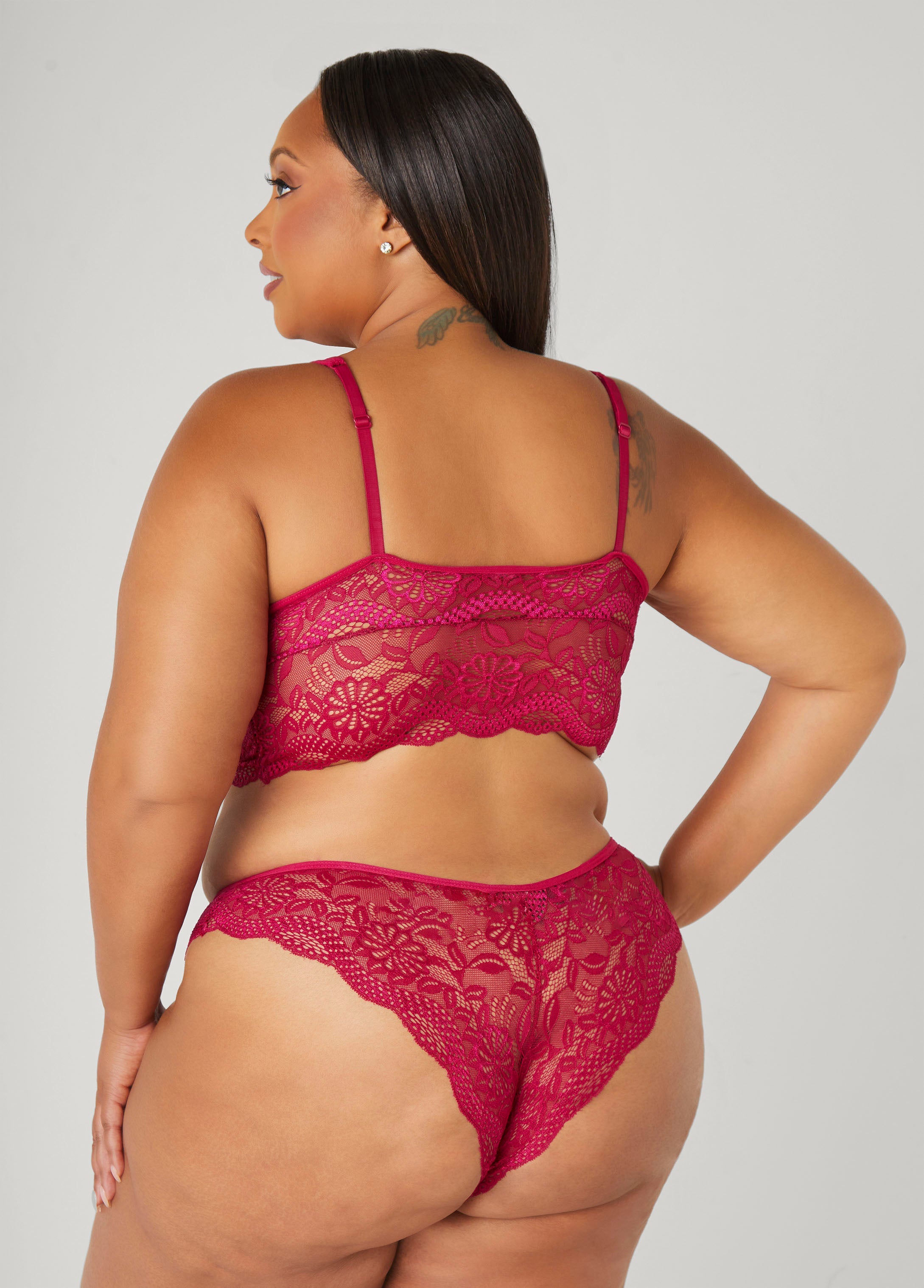 This stretch-lace set is all tease & no trouble. The bralette slips right on with scalloped trims, adjustable straps and padded cups you can pop in or leave out. The matching panty pulls on soft and sweet with an elastic waistband and a promise to play nice... for now.