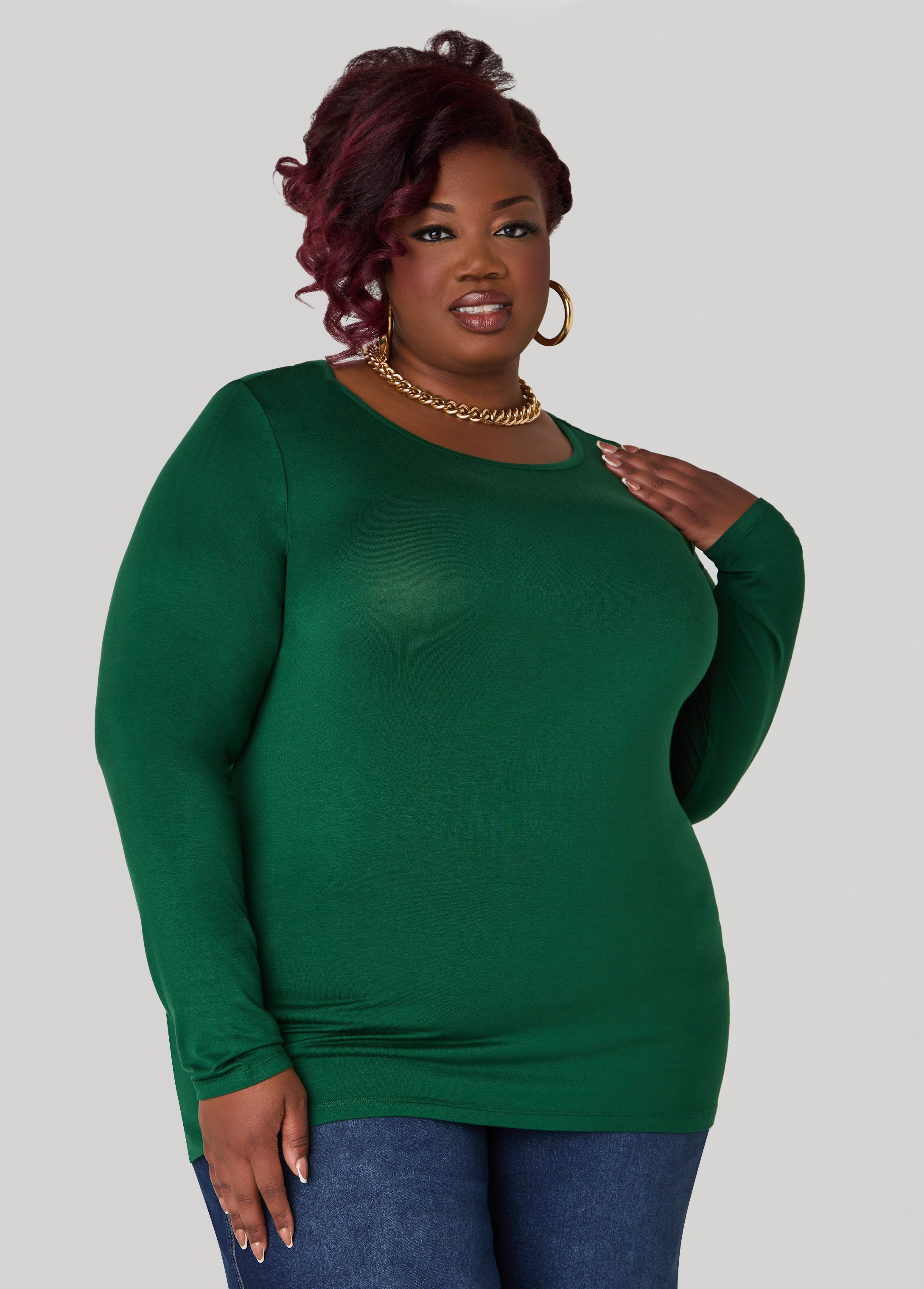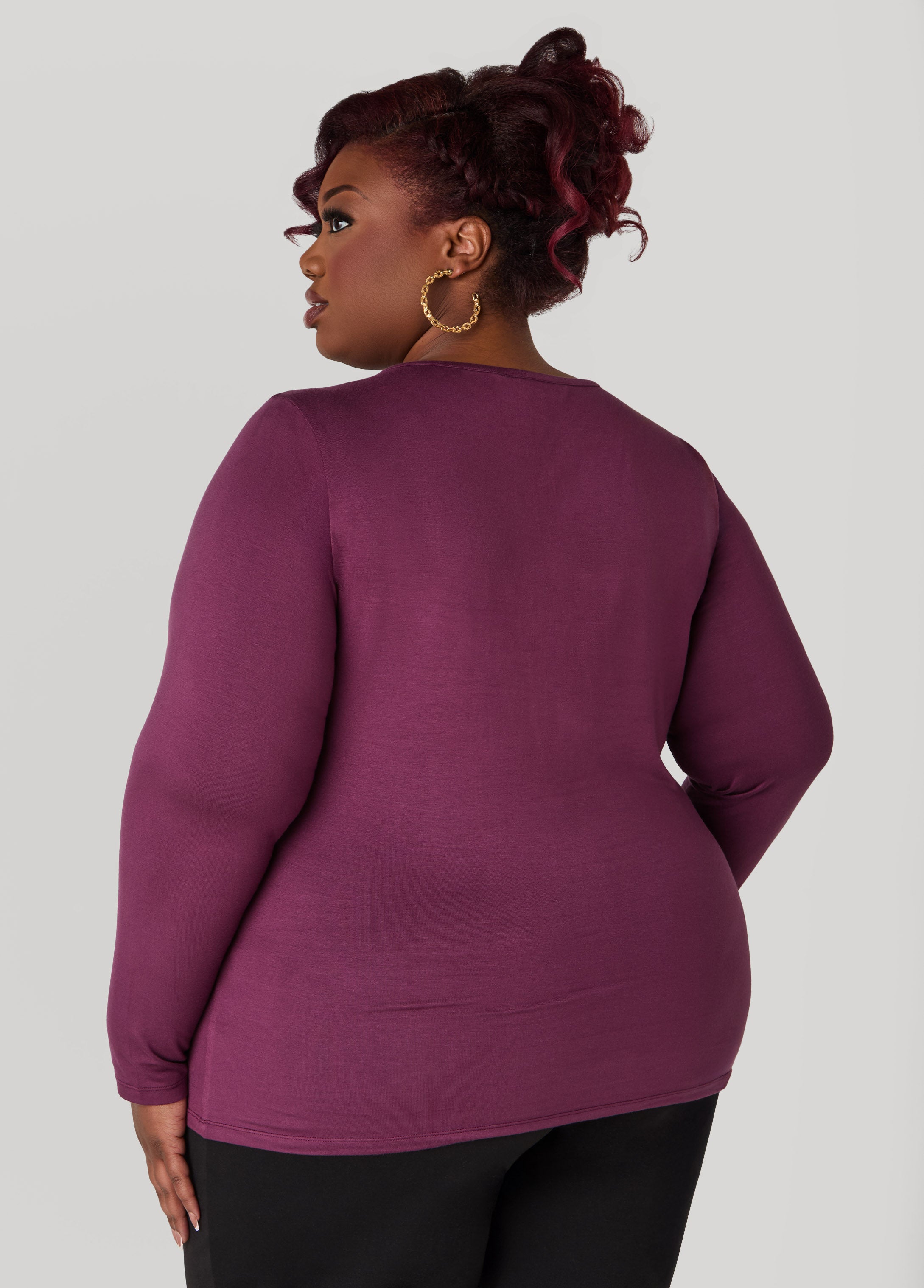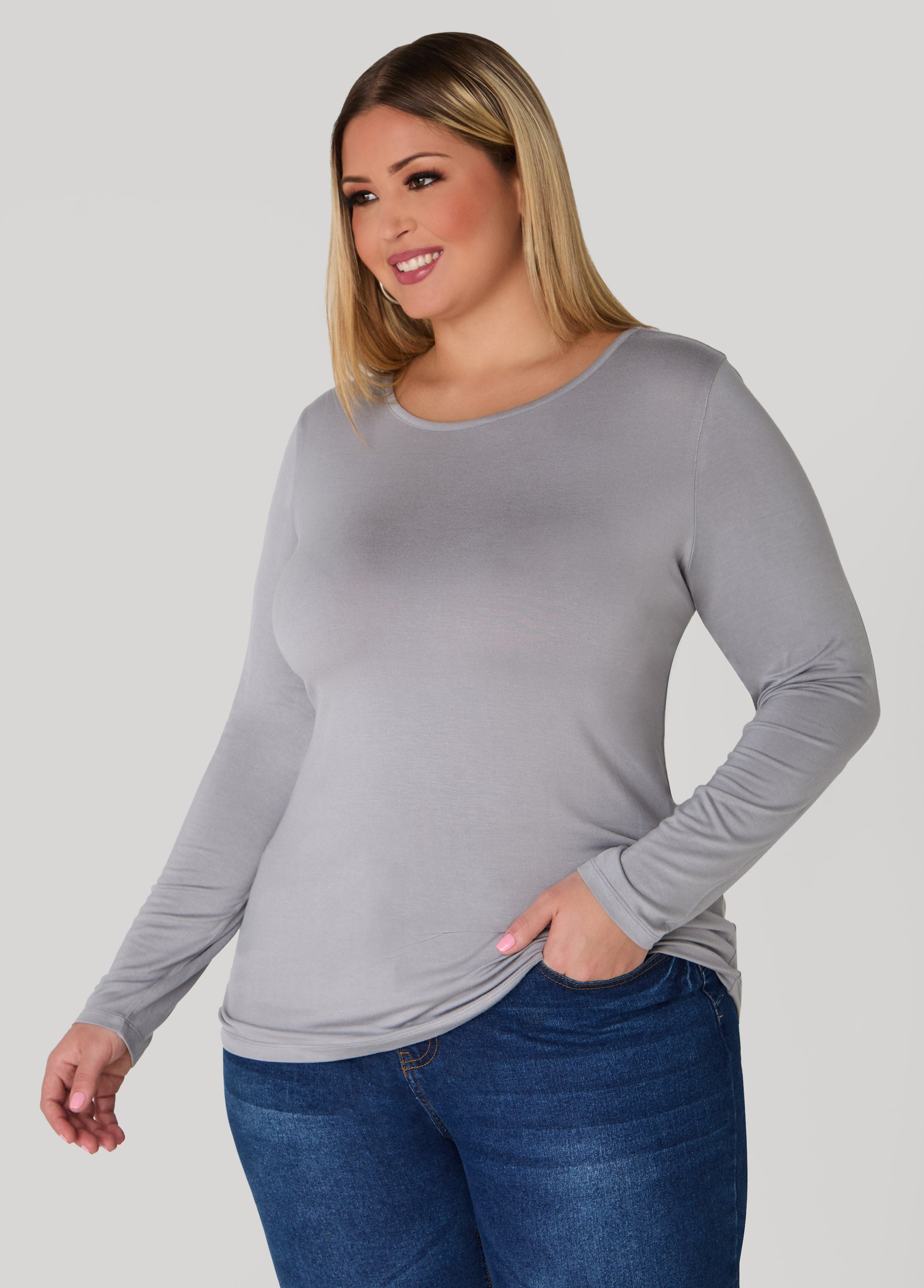 Get back to the basics with Ashley Stewart's collection of long sleeves Basic tees. This stretchy style gets everything right, from the relaxed fit to its versatility.