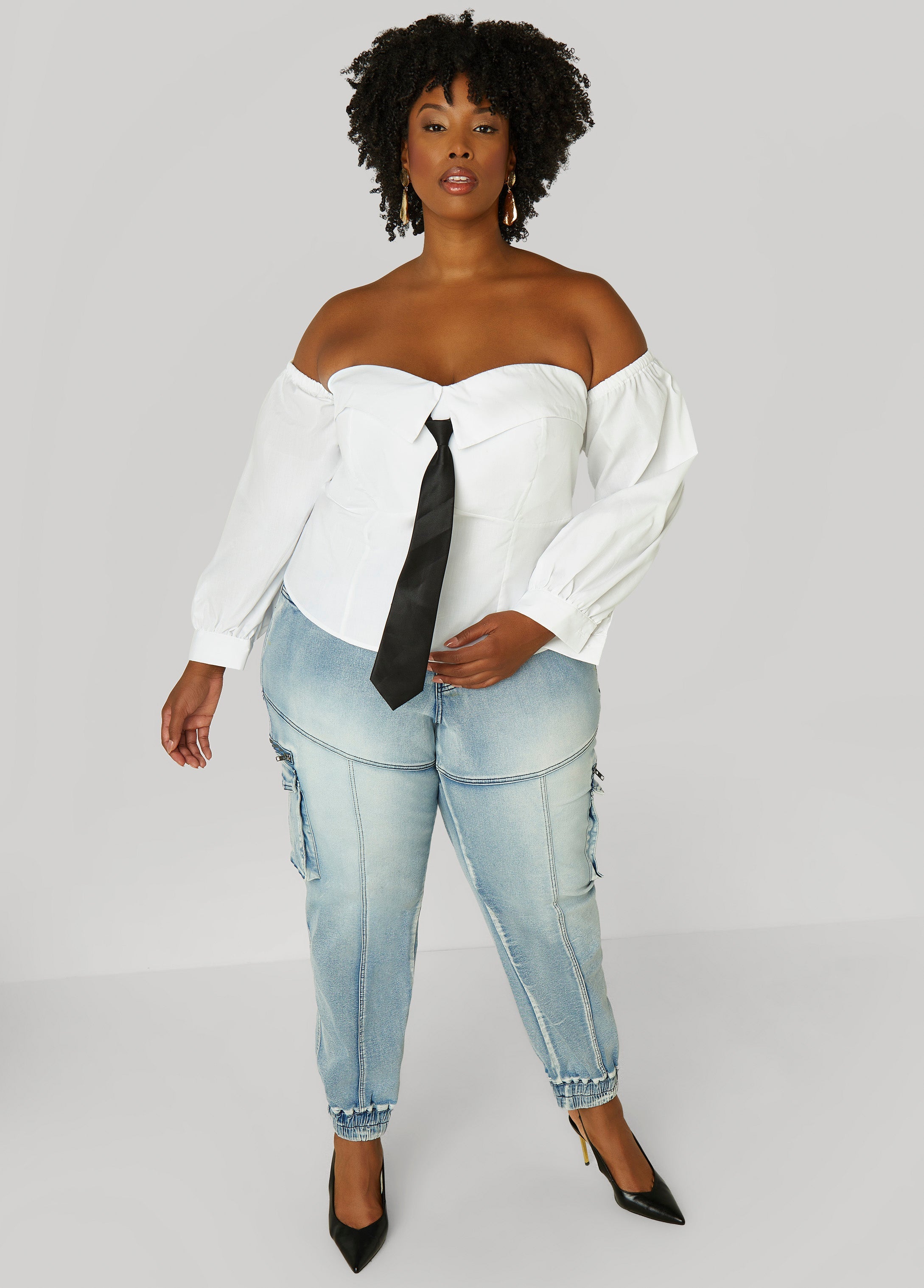 This off-the-shoulder poplin shirt flips the script on a classic collar with a foldover bustline that dares to dip low. A detachable tie brings some naughty to your nice, and that corset-fit body? Snatched.